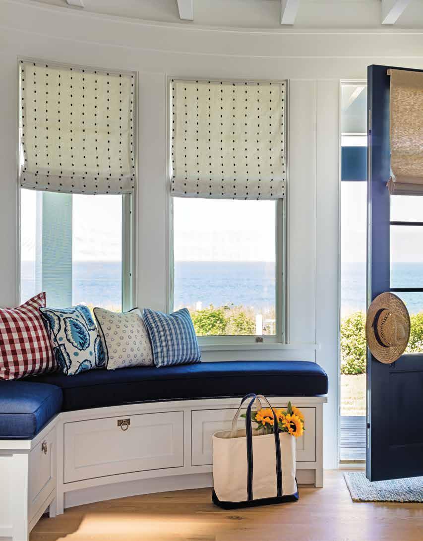 opposite In a new seaside house in a historic neighborhood, artisan-crafted built-ins include a bench at the entry, calling attention to the rounded bay and the ocean beyond.