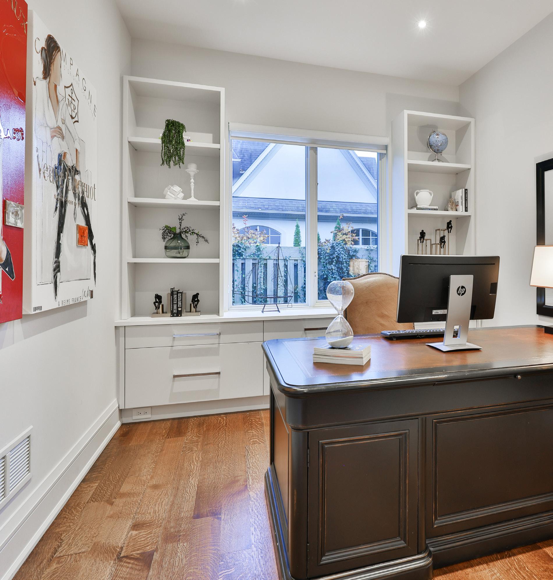 Experience the luxurious warmth and charm of this modern home with beautiful hardwood flooring throughout the main level. The office offers a picturesque view of the yard and comes complete with custom built-in shelving and window with roller shades , making it a perfect place to work or study.