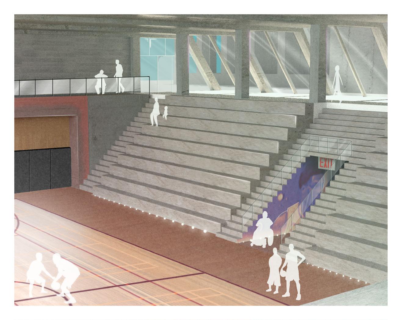 The response to the project was to bring the recreational gym underground and bridge the connection between the current building with the new one from below. The ramps are oriented on the west side, designed to block out sunlight when setting, creating a path to the roof and creating a path under to view the gym. There is an opaque glass floor that allows for light to brighten the lower level, and an angled wall mostly made of glass to allow light in that upper path, but not get in the eyes of the players. The new building is relatively the same height as the old building beside it, creating a feeling of unity side by side. Additionally, a Mural with some of the past greats in Raptors history and current players was added in the tunnel, connecting and leading toward the gym.