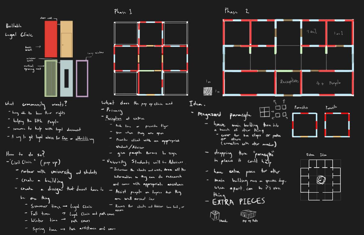 The most important details in this text are that the author has learned more about working with people than ever before, and that this term's project is for the people. They were more involved with the community and getting what they wanted out of this, and after talking to all the members and hearing what they heard, initial plans had to change. They chose a more broad and simplistic approach that can allow for the community to find use in the project in many different ways. The project is called Para-siting, as it begins as one large modular organism that can be reconstructed in many different places, serving different things.