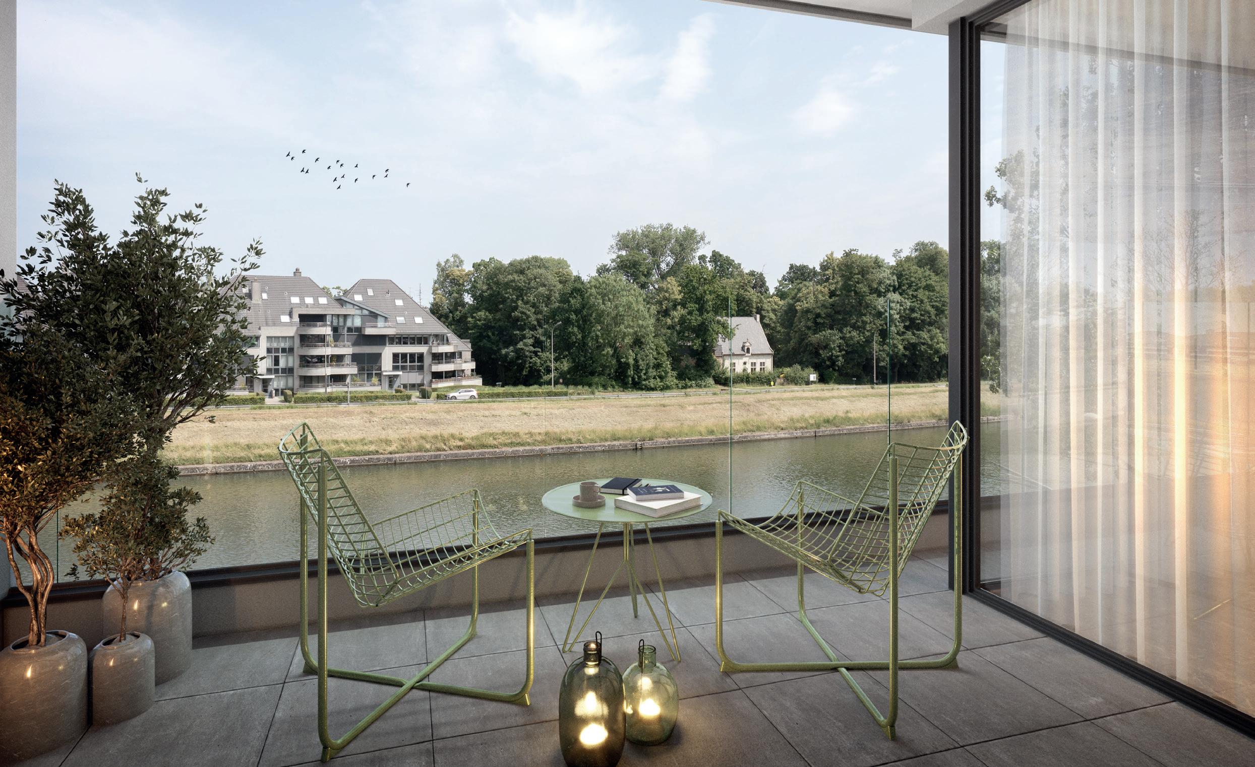 Bovendien beschikt elke unit over een ruim, zonnig terras, dat uitkijkt over het kanaal Brussel-Schelde. Dit unieke uitzicht geeft je elke dag een instant vakantiegevoel, met een wijds panorama over water en groen.