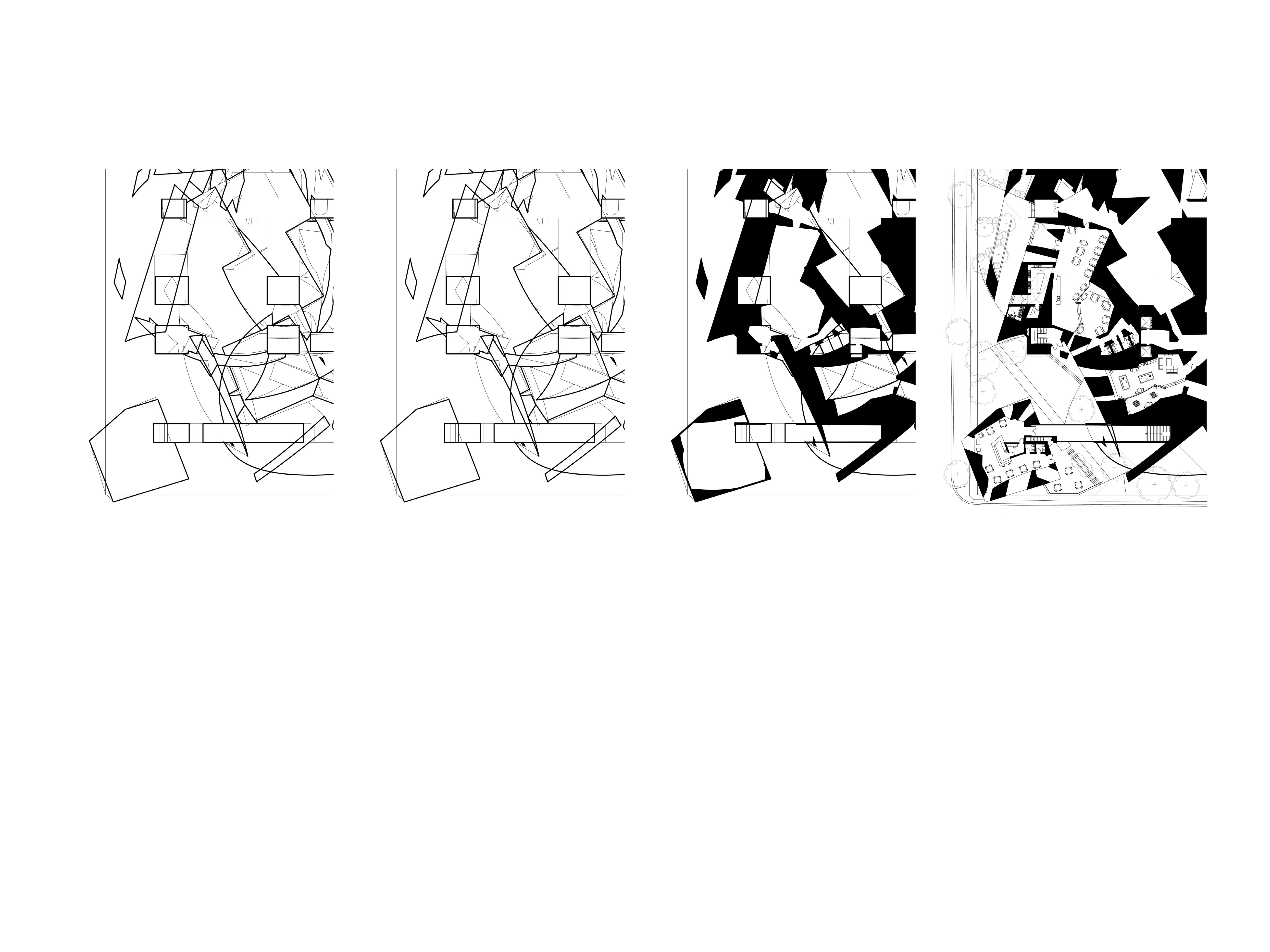 SECTION AND FLOOR PLAN PROFILE LINES FROM PHASE 1 INITIAL OBJECT FROM PHASE ONE WAS A STEPPING STOOL. BOOLEAN SUBTRACT TWO CLOSED EXTRUSIONS DUPLICATE AND ORIENT TO EXTEND FOOTPRINT SPLIT AND DIVIDE COMBINE FORMS TO PRODUCE DYNAMIC MASSING INTRODUCE SEPARATED MASSING FROM PREVIOUS PROCEDURE INTO THE MIX. PRODUCING CIRCULATION SPLIT MASSING 1. 2. 3. 5. 4. 5