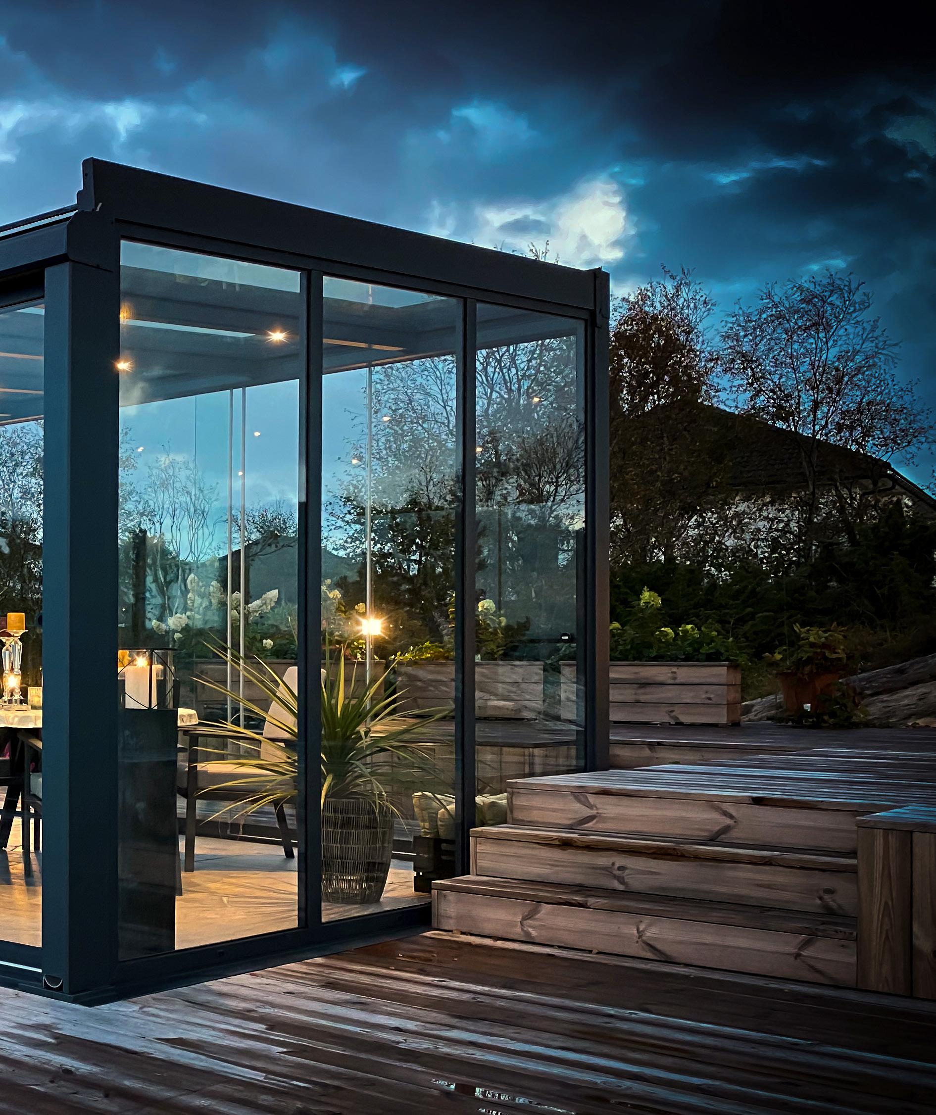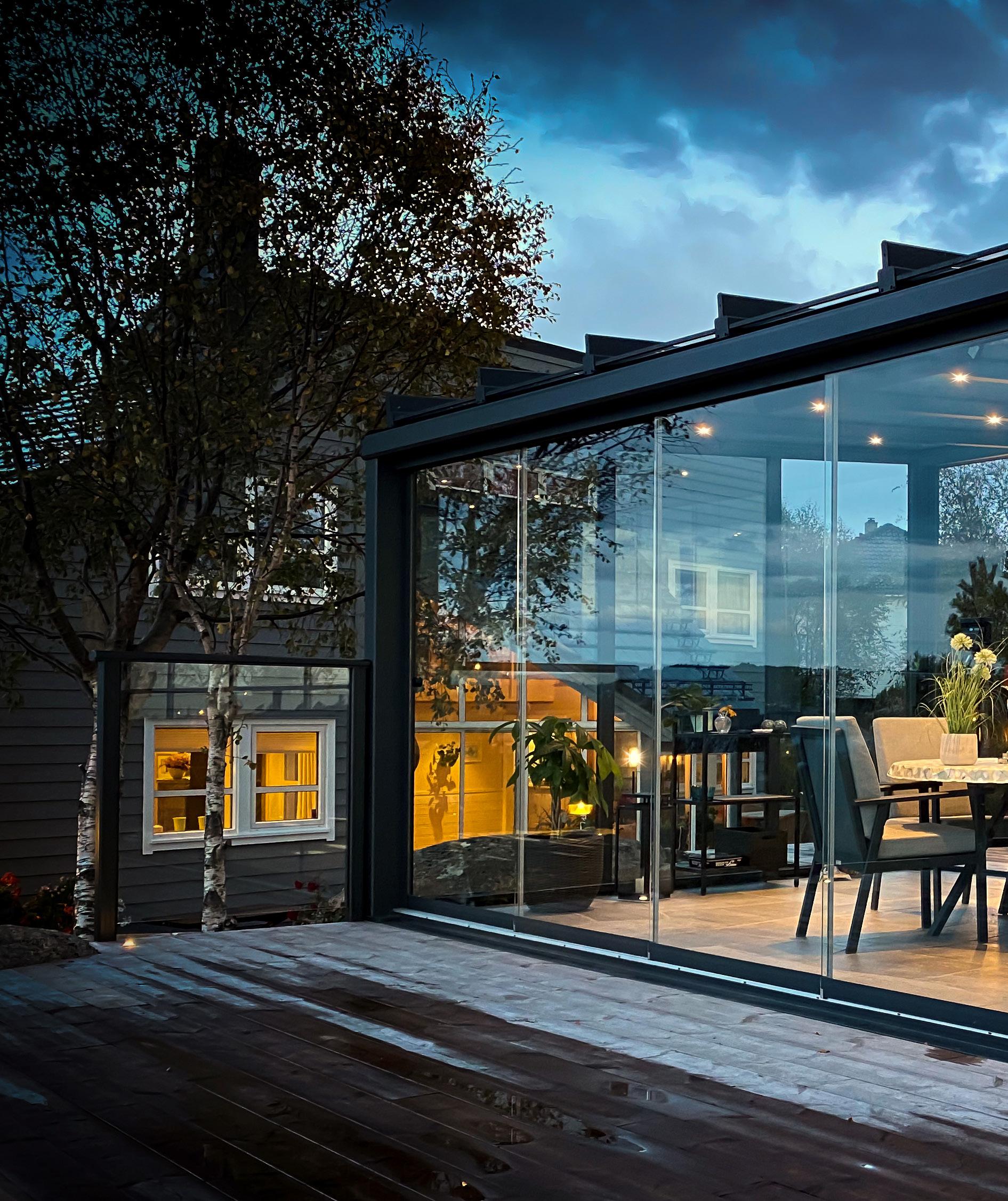 Ønsker du en tørr passasje fra et glasstak over til en pergola? Det har vi levert til mange. Drømmer du om å sitte i en utestue og varme deg på en integrert peis? Det har vi montert! En sømløs overgang fra innendørs til utendørs rom? Lurt - vi har flere forslag vi kan vise frem.
