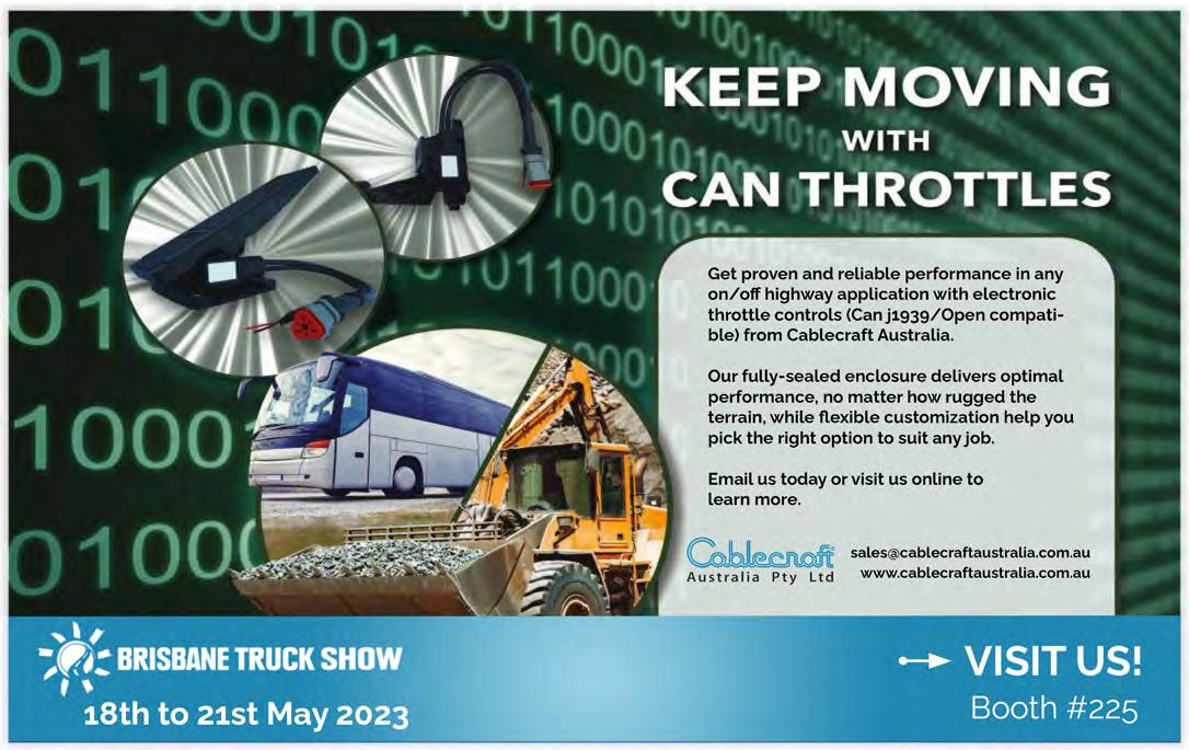 Cablecraft Australia is displaying its new generation of MCS CAN position sensors at this year’s show which can be used on throttle pedals, hand throttles or as stand-alone products