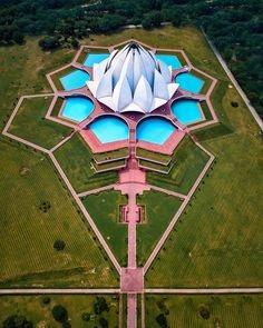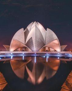 Lotus Temple is a place of worship. Most buildings in New Delhi, India are influenced by Mughai Architecture which is characterised by large bulbous onion domes, uses white marble and red sandstone as well as delicate ornamentation work, with also gardens surrounding all four sides of the buildings
