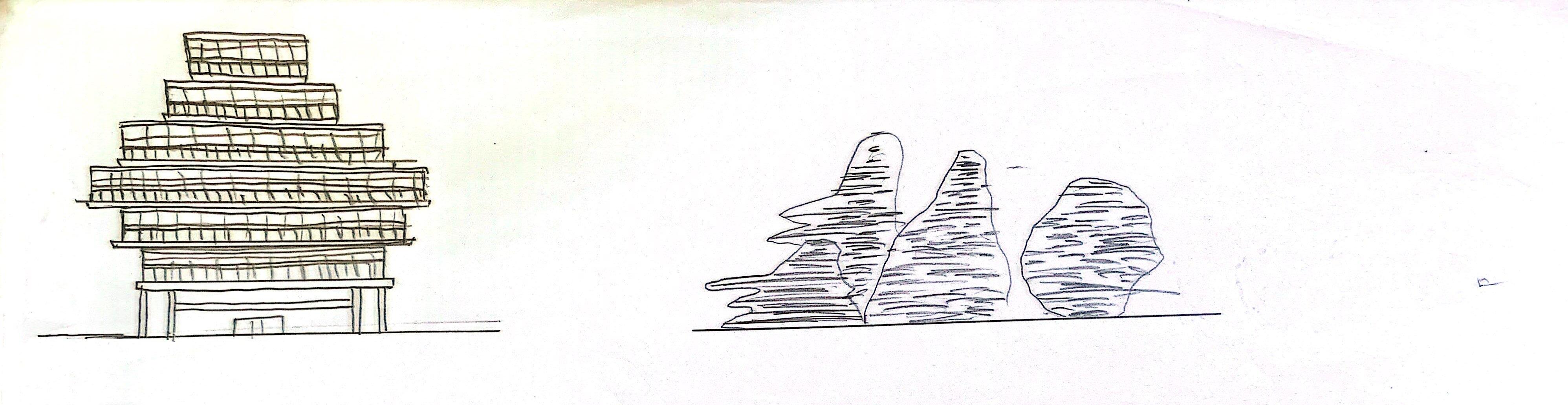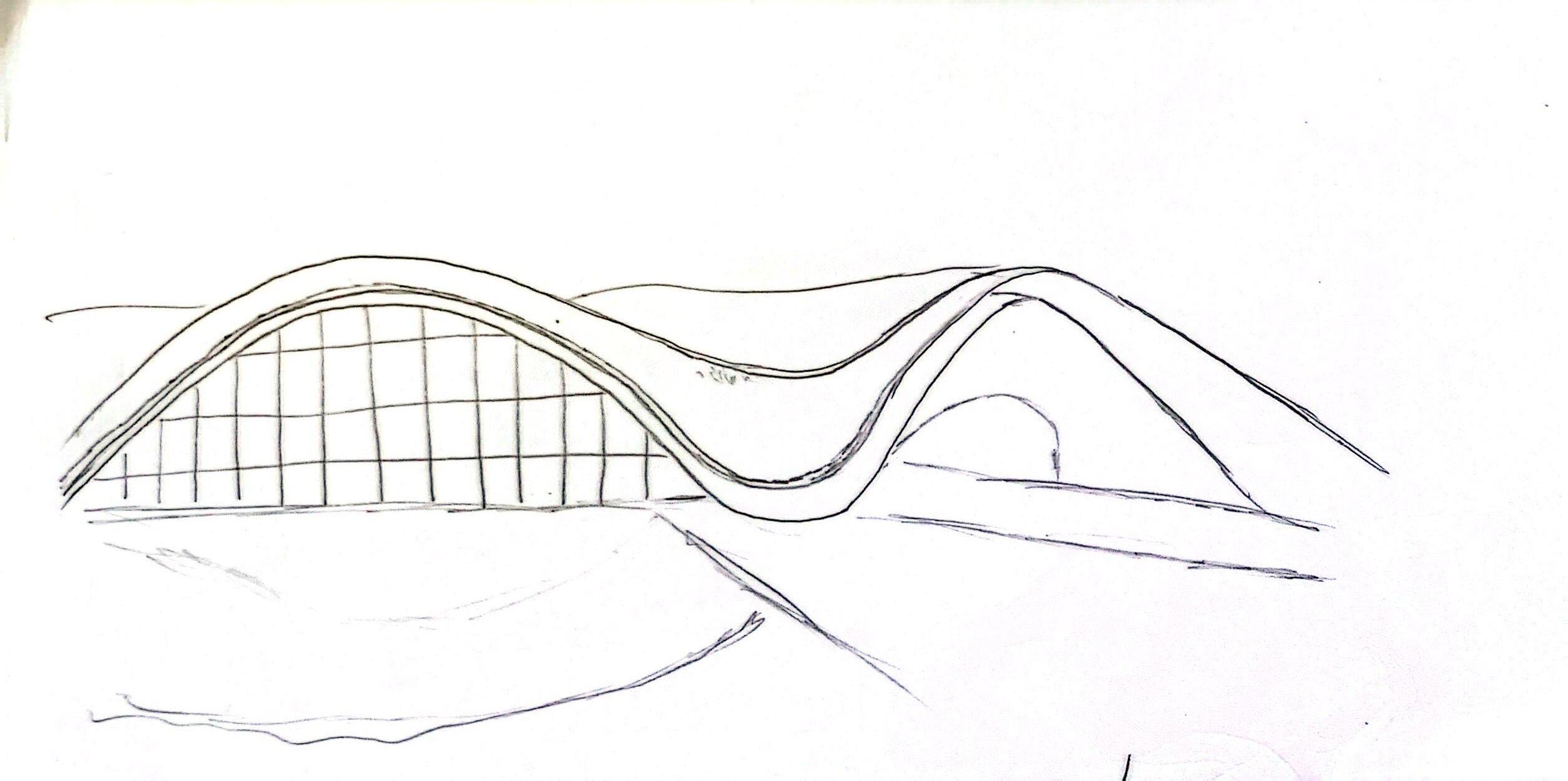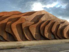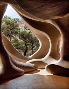 It takes natural elements to designed its form. The plan and elevations of the building are projected by the external shape of the mountain and the land contour. The architects then uses geological movements caused by a worm wiggling in the ground. The curve shape is a figurative representation of the existing mountain. The project seems to be squeezed out of the ground by natural forces underneath the crust. Green plants covers over the roof which makes the building like a natural mountain that exists on the site.