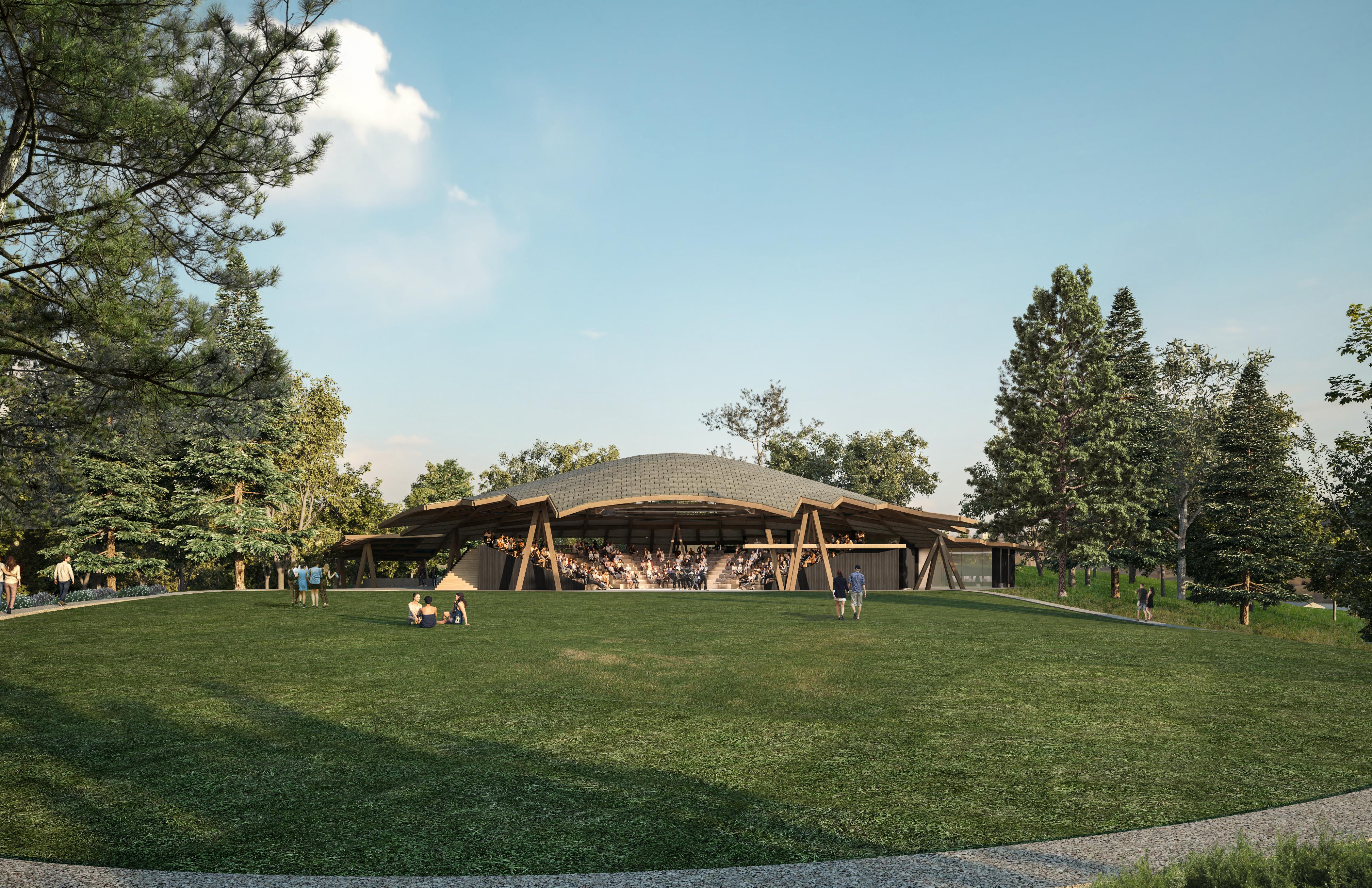 The theater as organic machine. The innovative roof structure creates comfortable shading for visitors, while also framing views and shielding from afternoon glare. Prevailing winds provide passive cooling. Rain water is collected, stored, and used to reduce freshwater (well water) demand. Solar panels reduce power loads.