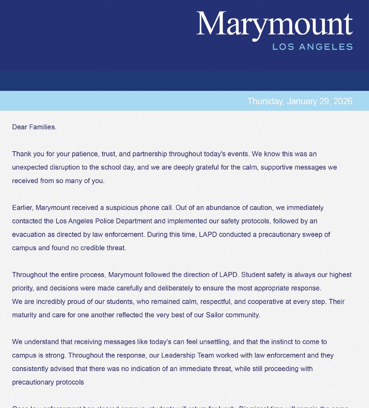 “Earlier, Marymount received a suspicious phone call,” the email said. “Out of an abundance of caution, we immediately contacted the LAPD and implemented our