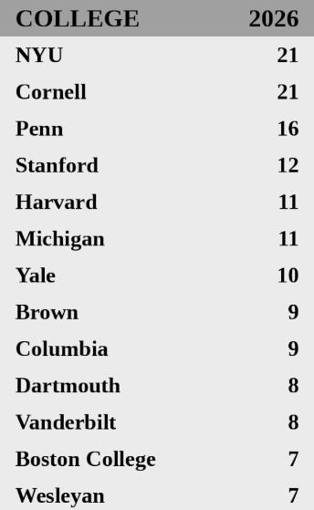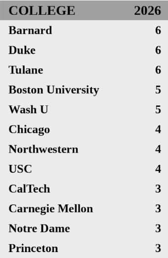 Early Application Data: Top 25 Colleges Applied to ED/REA for the Class of 2026 242 ED/REA applications were submitted by the class of 2026 according to the deans’ office.