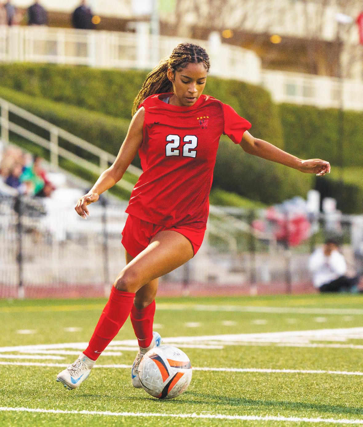 IN CONTROL: Shyla Haqq ’26 works to keep the ball away from a Sierra Canyon defender on Jan. 26, the girls soccer team's senior night.