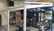 400x250 cm - polycarbonaat dak - incl. glasschuifwanden, balein zonwering, poly- carbonaat spie helder en composiet vlonder.