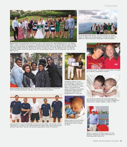 Chi Phi brothers Drew Oliveira ’13, Henry Farrand ’14, Andrew Guild ’13, Adam Law ’12, Kevin Gannon ’13 and Colin Desko ’13 gather for a photo atop Mount Washington in New Hampshire. Meghan Welsh ’05 married Marc Van Keuren on July 13, 2013 at the York Harbor Reading Room in York Harbor, Maine. Hobart and William Smith alums in attendance were: Matt Sullivan ’05, Meghan Spelman Vigne ’05, Billy Vigne ’05, Nick Grimshaw ’04, Debbie Minarick Grimshaw ’05, MAT ’06, Justin Macklin ’04, Laura Parker Macklin ’05, Meghan Welsh Van Keuren ’05, Marc Van Keuren, Christine Curry Fitch ’05, Kathleen Frazier ’05, Breanna Greene ’05, Ashley Varrato ’05, Shelly Smith ’05, Caroline Wenzel Chapman ’05, Mia Rabinowitz Cote ’05, and Matt Cote ’05.