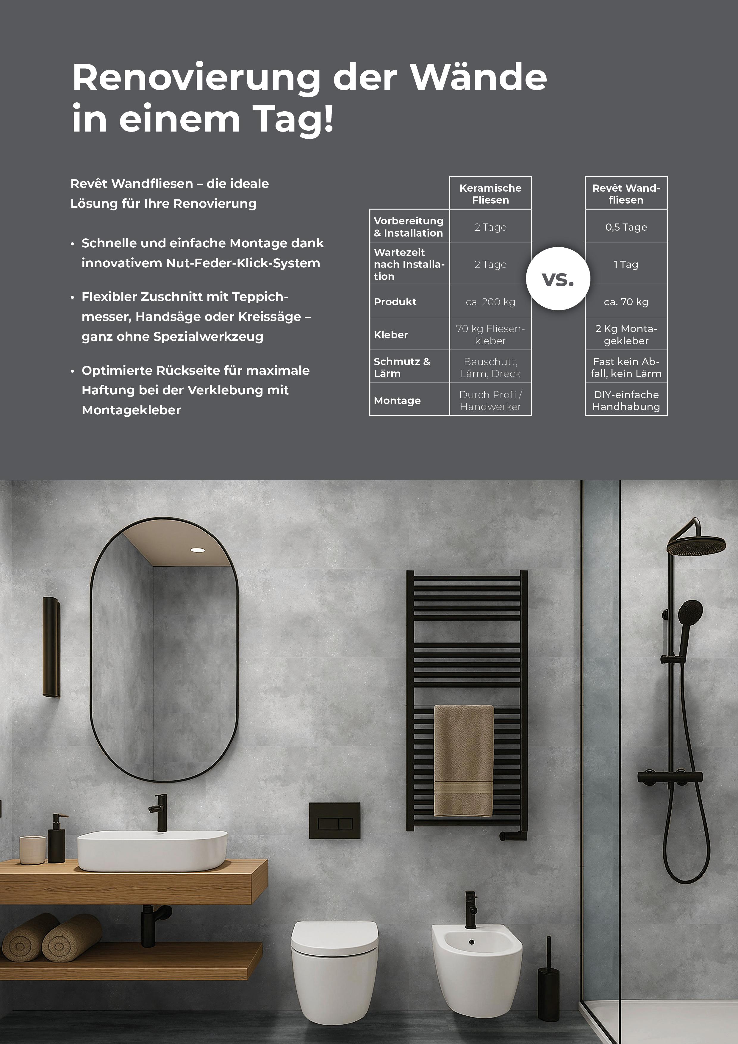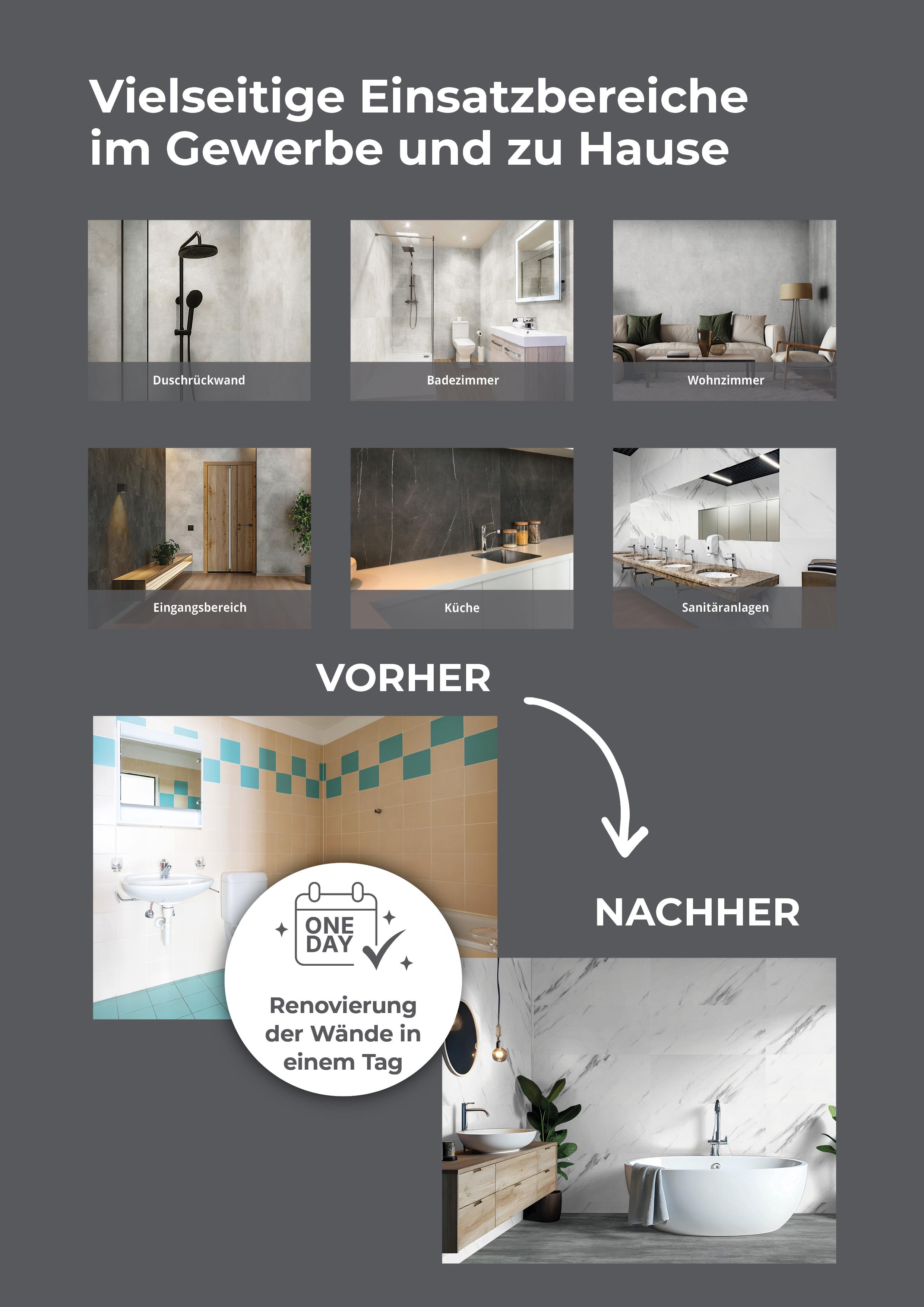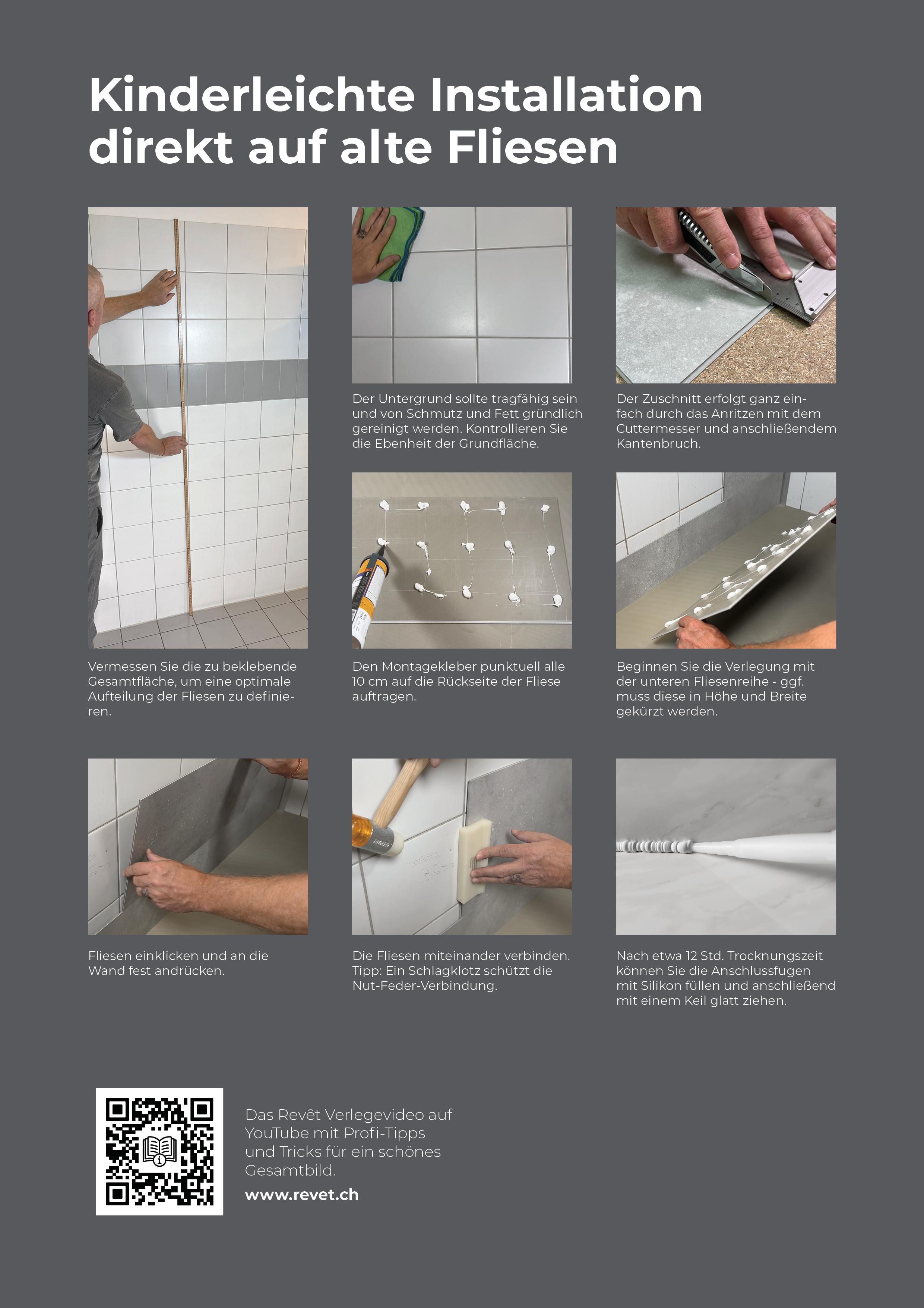 Zuhause einfach und schnell selbst renovieren. Das leichte und wasserfeste Material ermöglicht eine schnelle und einfache Montage direkt auf alten Fliesen - ganz ohne lästiges Verfugen.
