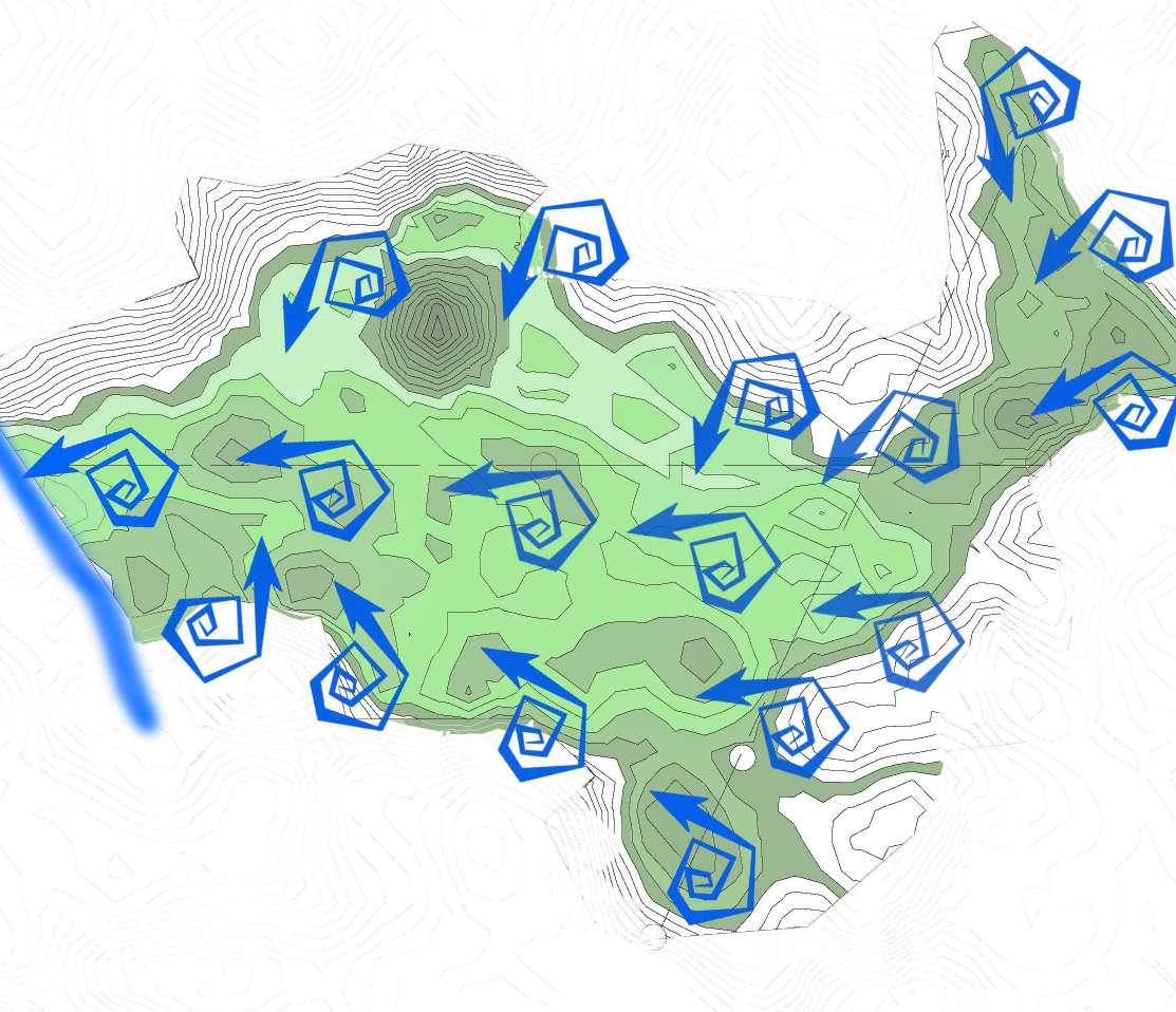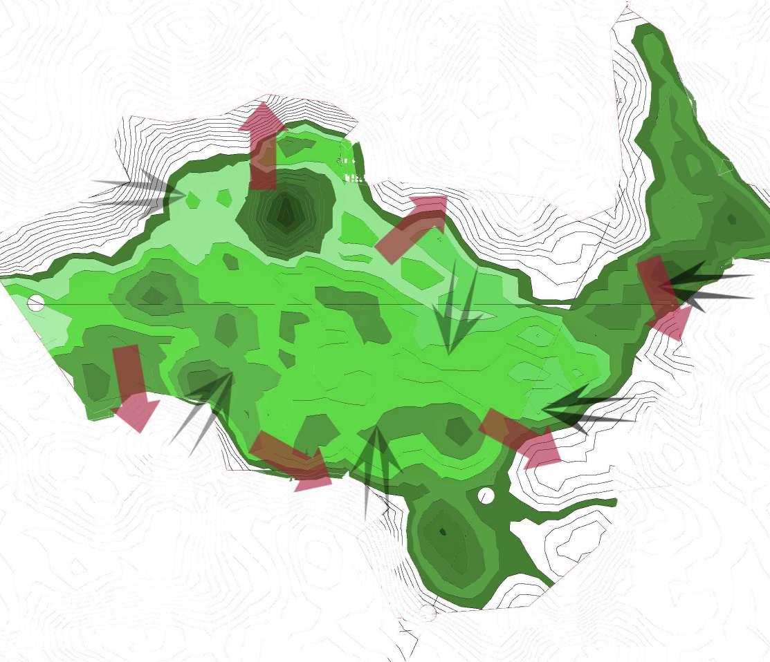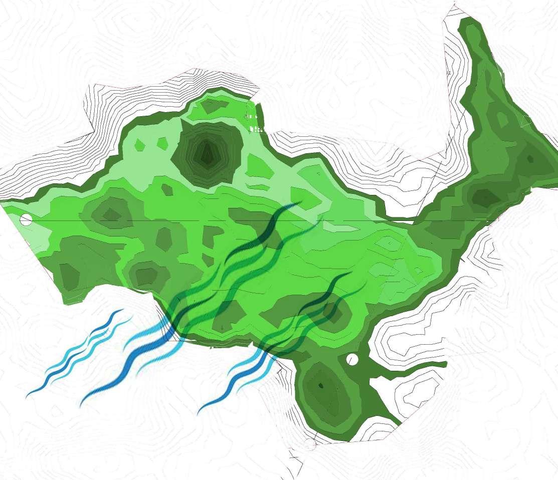 GUIDE : AR ANIMESH DEV B180001AR SIDHARTH BENOI SPORTS HUB The annual wind rose below showing how wind speed and direction are typically distributed in Kochi. The graph below shows the average values of various meteorological paramateres over the year in Kochi. The graph above shows the daily variation of meteorological paramteres over the year in Kochi. The graph above shows the daily variation of meteorological paramteres over the year in Kochi. The precipitation varies 546 mm | 21 inch between the driest month and the wettest month. The average temperatures vary during the year by 2.8 °C | 5.0 °F. The month with the highest relative humidity is July (89.14 %). The month with the lowest relative humidity is February (73.56 %). The month with the highest number of rainy days is July (28.73 days). The month with the lowest number of rainy days is January (5.73 days). N The site for the proposed project is predominantly flat, with occasional small earth mounds creating minor contours in three distinct locations. These contours are characterized by a 50 cm interval between each elevation change, providing subtle variations in topography across the site. The flat terrain offers a blank canvas for design implementation, The double-head arrow indicates a view to the site The red arrow indicates the view from the site while the view from the site is obstructed because of the 3-meter dip of the site the view toward the site from all directions. The major vegetation is around the site with coconut trees we can also find coconut trees and wild bushes and shrubs in the site the other major plant is wild pineapple shrubs. The micro climate and wind direction are predominently affected by the periyar river and the wester arabian sea, the wind flows from south-west to north east and south side. Most of the site is flat and at a level of below 3 meters from the main road. The drain pattern from the contour shows that the water flows to the south west side of the site and to the nerarby water stream which goes to the periyar river. The major noise source is the nh highway towards the eastern side of the site, other noise sources are small residential areas and commercial stores around the site and traffic through roads. COCUNT TREE SHRUBS WILD PINEAPPLE Good natural ventilation can reduce or eliminate air conditioning in warm weather, if windows are well shaded and oriented to prevailing breezes To capture natural ventilation, wind direction can be changed up to 45 degrees toward the building by exterior wingwalls and planting Long narrow building floorplan can help maximize cross ventilation in temperate and hot humid climates To facilitate cross ventilation, locate door and window openings on opposite sides of building with larger openings facing up-wind if possible Screened porches and patios can provide passive comfort cooling by ventilation in warm weather and can prevent insect problems On hot days ceiling fans or indoor air motion can make it seem cooler by 5 degrees F (2.8C) or more, thus less air conditioning is needed Kunnis Maslid Use open plan interiors to promote natural cross ventilation, or use louvered doors, or instead use jump ducts if privacy is required To produce stack ventilation, even when wind speeds are low, maximize vertical height between air inlet and outlet (open stairwells, two story spaces, roof monitors) A whole-house fan or natural ventilation can store nighttime ‘coolth’ in high mass interior surfaces (night flushing), to reduce or eliminate air conditioning This is one of the more comfortable climates, so shade to prevent overheating, open to breezes in summer, and use passive solar gain in winter Traditional passive homes in temperate climates used light weight construction with slab on grade and operable walls and shaded outdoor spaces Traditional passive homes in warm humid climates used high ceilings and tall operable (French) windows protected by deep overhangs and verandahs Shaded outdoor buffer zones (porch, patio, lanai) oriented to the prevailing breezes can extend living and working areas in warm or humid weather Provide enough north glazing to balance daylighting and allow cross ventilation (about 5% of floor area) Low pitched roofs with wide overhangs works well in temperate climates Use plant materials (bushes, trees, ivy-covered walls) especially on the west to minimize heat gain (if summer rains support native plant growth) In wet climates well ventilated attics with pitched roofs work well to shed rain and can be extended to protect entries, porches, verandas, outdoor work areas If soil is moist, raise the building high above ground to minimize dampness and maximize natural ventilation underneath the building Minimize or eliminate west facing glazing to reduce summer and fall afternoon heat gain Window overhangs (designed for this latitude) or operable sunshades (awnings that extend in summer) can reduce or eliminate air conditioning MOUNDS CONTOUR ANALYSIS WIND VIEW DRAIN ANALYSIS ECOLOGY NOISE