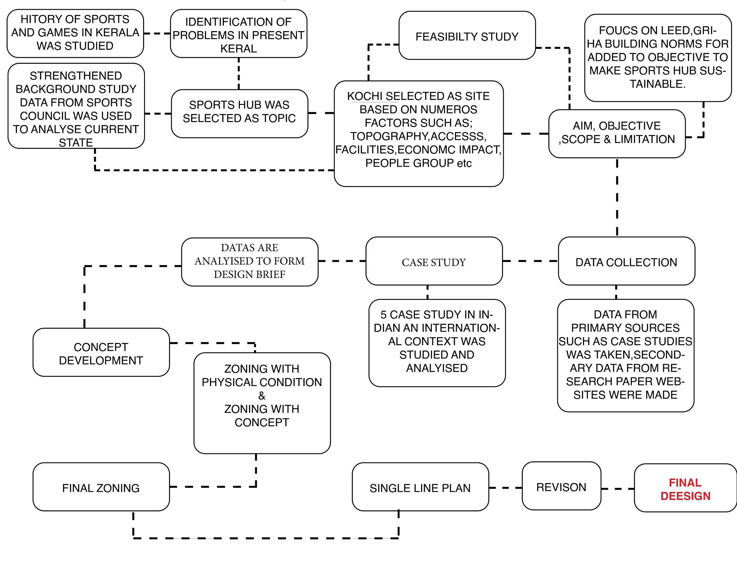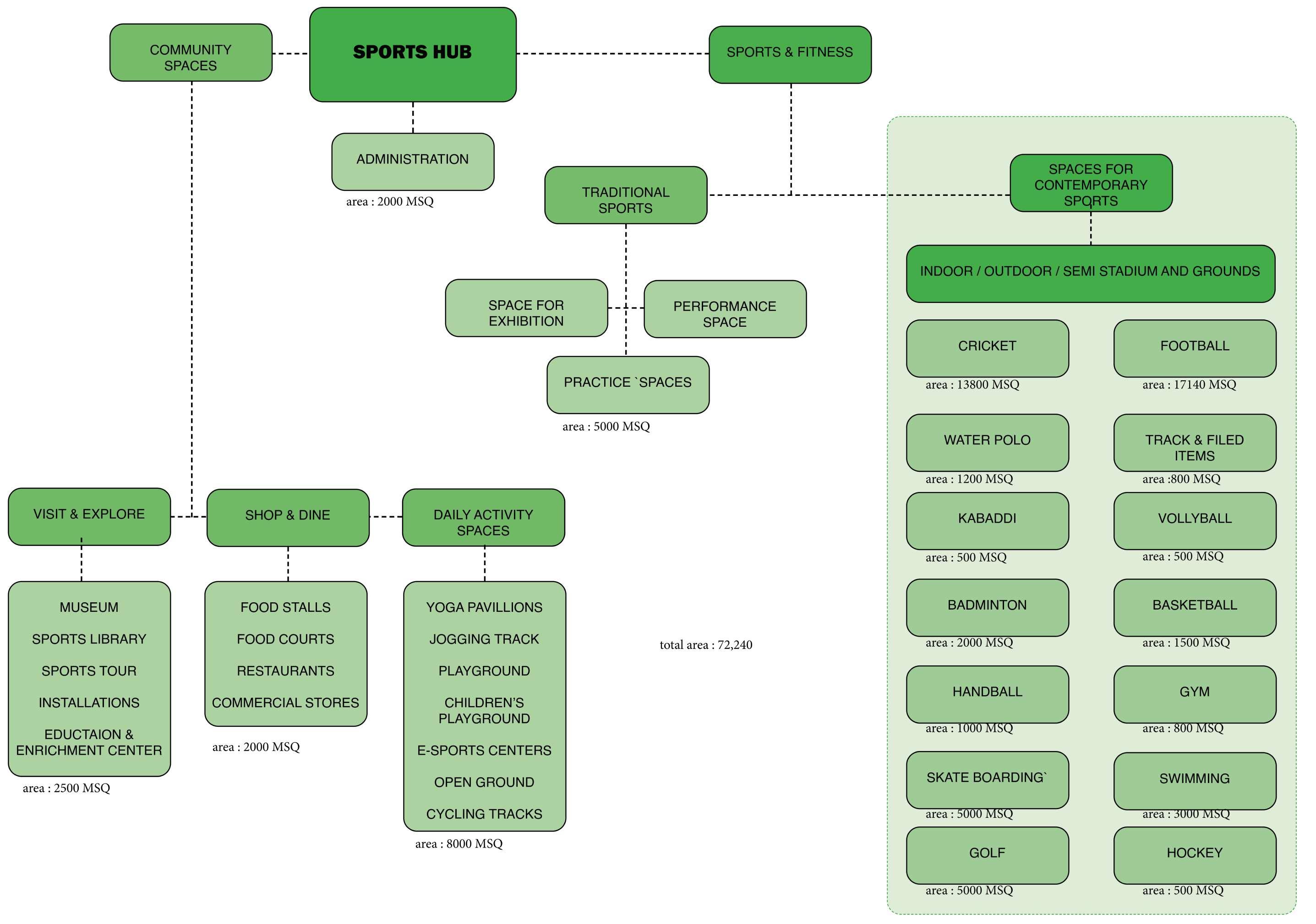 event. Youth Development Programs: Implement youth development programs that expose young athletes to a variety of sporting disciplines, including both traditional and global sports. By providing opportunities to learn and train in different sports, these programs promote holistic development and help participants discover their talents and interests. Cultural Festivals: Organize cultural festivals that feature traditional sports alongside global sports competitions, music, dance, and food. These festivals serve as platforms for celebrating local heritage, fostering community engagement, and promoting sports tourism. Design philosophy: • Climate-responsive design: utilization of architecture suited to kerala’s tropical climate, emphasizing natural ventilation and energy efficiency. Inclusivity and accessibility: ensuring universal access for all user groups, including individuals with disabilities. Cultural sensitivity: incorporation of elements that reflect kerala’s cultural heritage within the architectural design. Sustainable practices: implementation of green building principles, aiming for certifications like leed or griha. Functional requirements: • Multi-sport arenas: specifications for arenas accommodating various sports such as basketball, volleyball, and indoor games. • Training facilities: design criteria for specialized training spaces tailored to different sports disciplines. • Recreational spaces: requirements for spaces that encourage leisure activities, yoga, and community gatherings. • Administrative areas: specifications for administrative offices, medical facilities, and support infrastructure. 1. Major built form being for the modern sports and games arenas and stadiums 2. The areas is alocated for public and boundryless areas such as parks and open field areas 3. For the traditional sports and to spread its awarness to people. 4. The other actvities areas that include commercia shop and food stalls