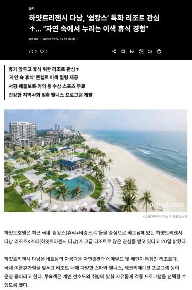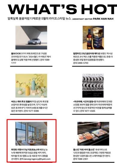 하얏트 리젠시 다낭 리조트 앤 스파는 Le Petit Chef, Vive Océane 및 헌신적인 웰니스 프로그램과 함께 Danang Tourism, Cosmopolitan Korea, Luxuo Vietnam, Tour de News 등 권위 있는 간행물에서 좋은 평가를 받았습니다 이번 기사들은 관광 부분에서 저희 리조트의 우수성과 혁신에 대한 저희의 약속을 강조합니다.