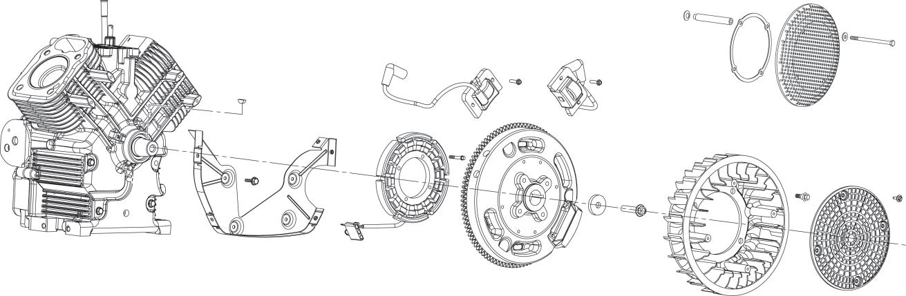 6. If an overlapping style flywheel screen is used, attach it to supports or flywheel. For a metal flywheel screen, apply Loctite® 242® to screw threads (M6) and torque to 9.9 N·m (88 in. lb.). Torque plastic screen mounting screws (M4) to 2.2 N·m (20 in. lb.).