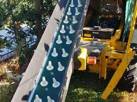 Two conveyors located out the front of the platform strategically positioned and adjustable for ground picking to commence without the need of picking bags.