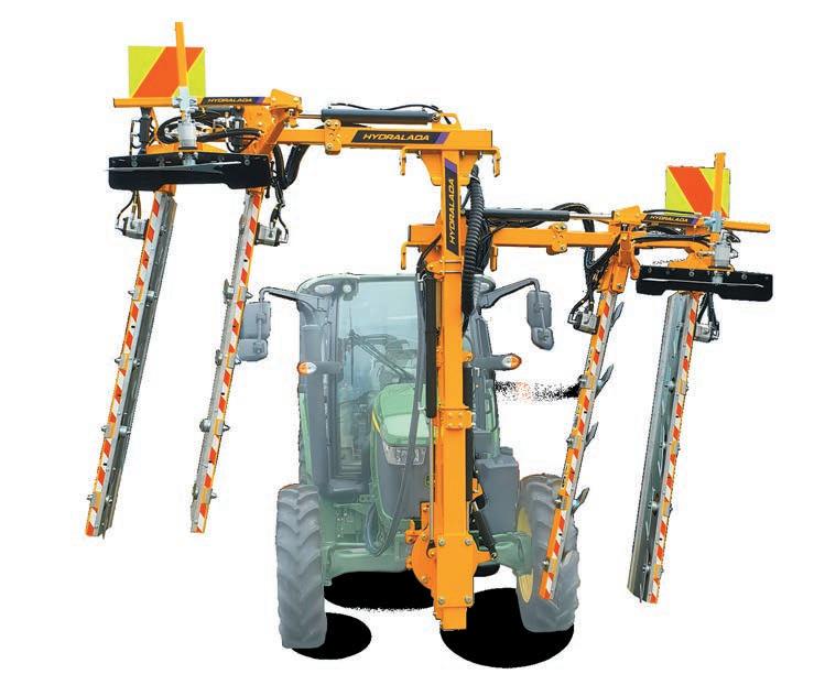 The Hydralada Inter Row VTR3 Trimmer has a double mast with independent Hydraulic lift and a vertical cutter boards and a rotary topper each side trimming two full rows in one pass.