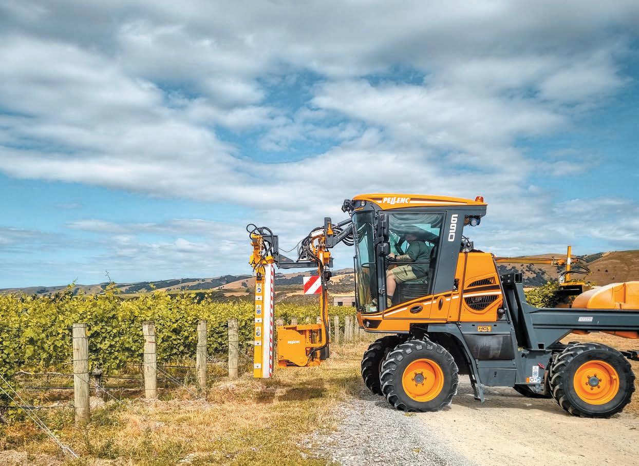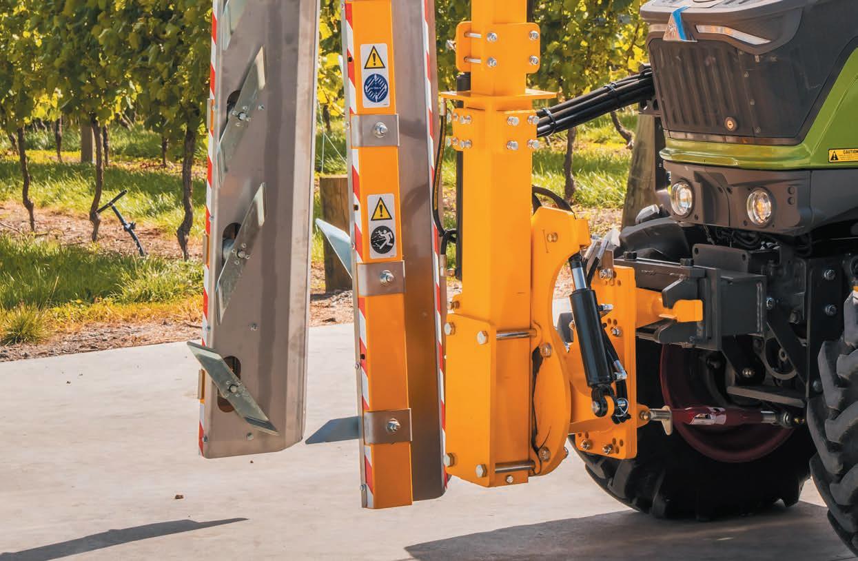 Single mast frame with hydraulic width adjustment makes it easy to adapt to suit different vineyards. Two vertical cutter boards can be adjusted and toppers moved independently. The single mast frame provides excellent visibility.
