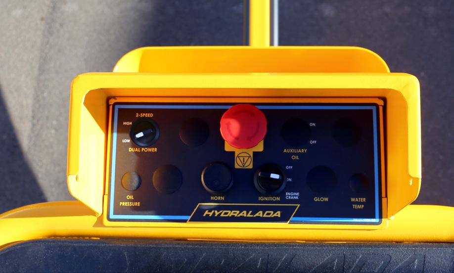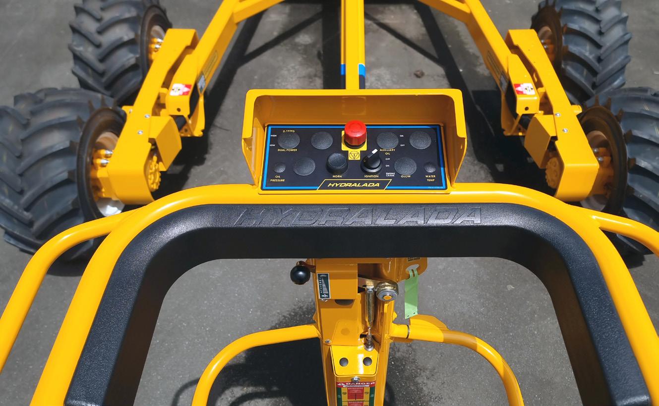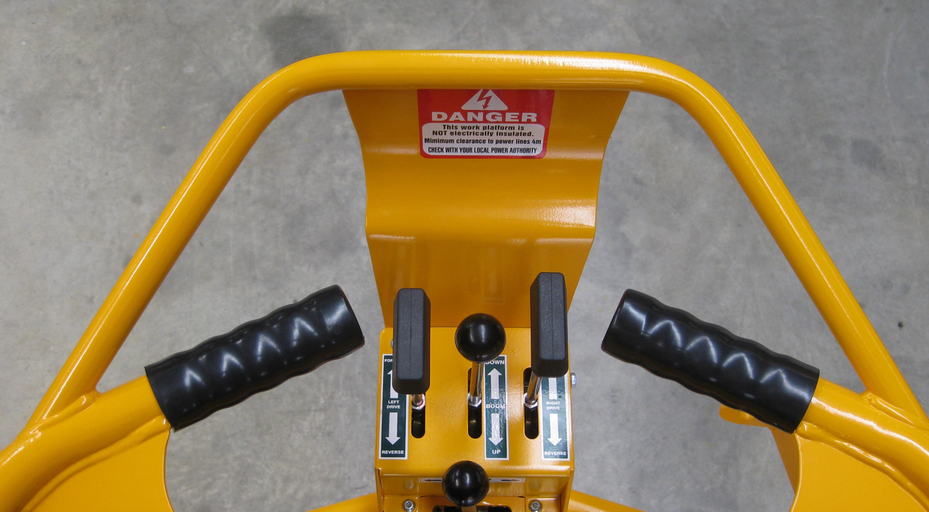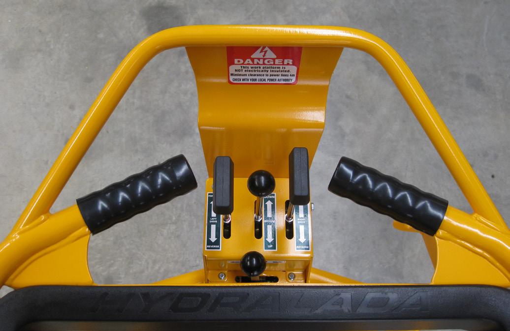 HAND CONTROLS - When hand controls are preferred to the standard Hydralada Three Pedal Control a simple Tiller Lever system located in the front of the operator’s platform is available. Two handle bars and two tiller levers (one for each drive wheel) makes this very safe and smooth to operate. Uses the foot deadman control option.