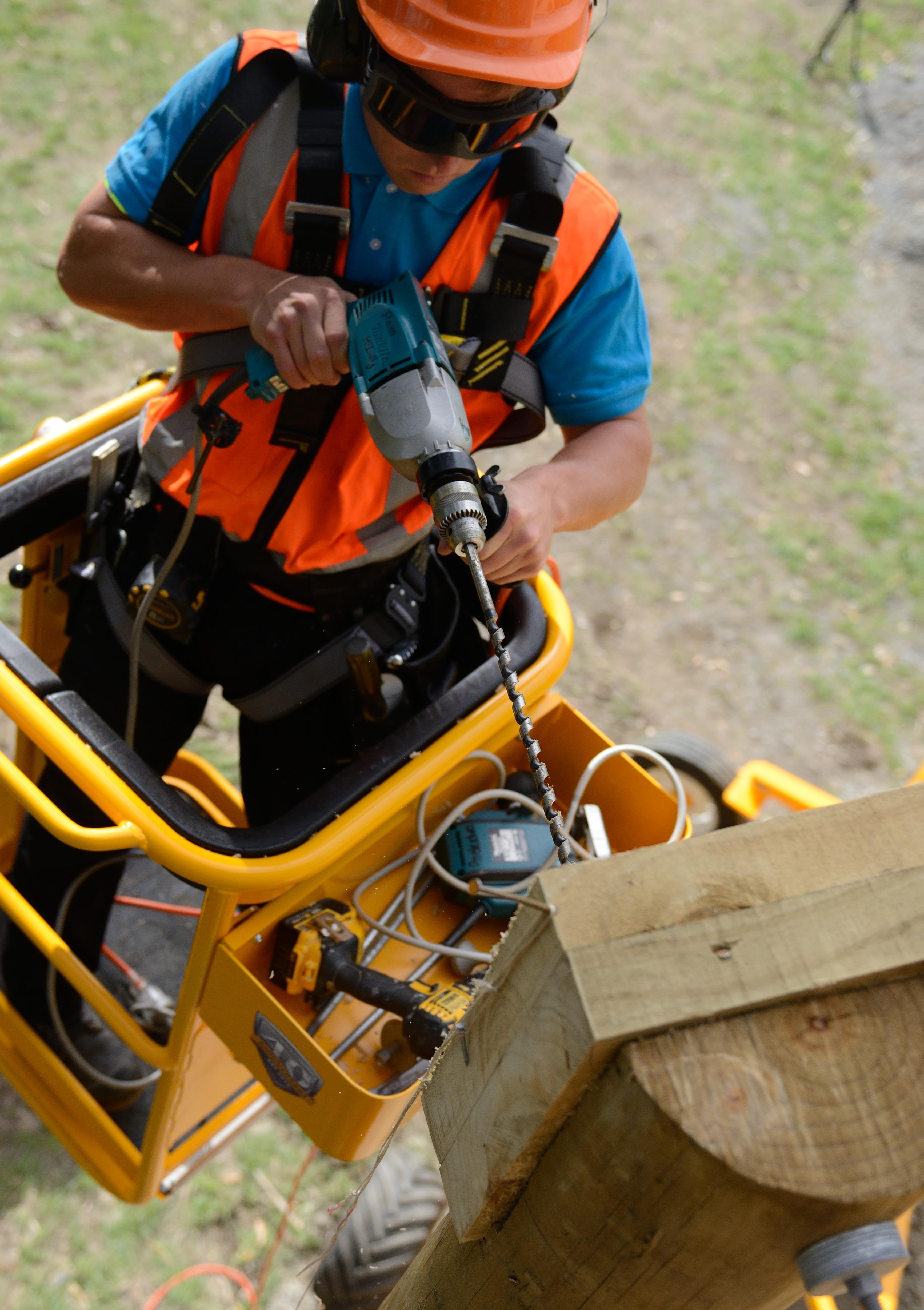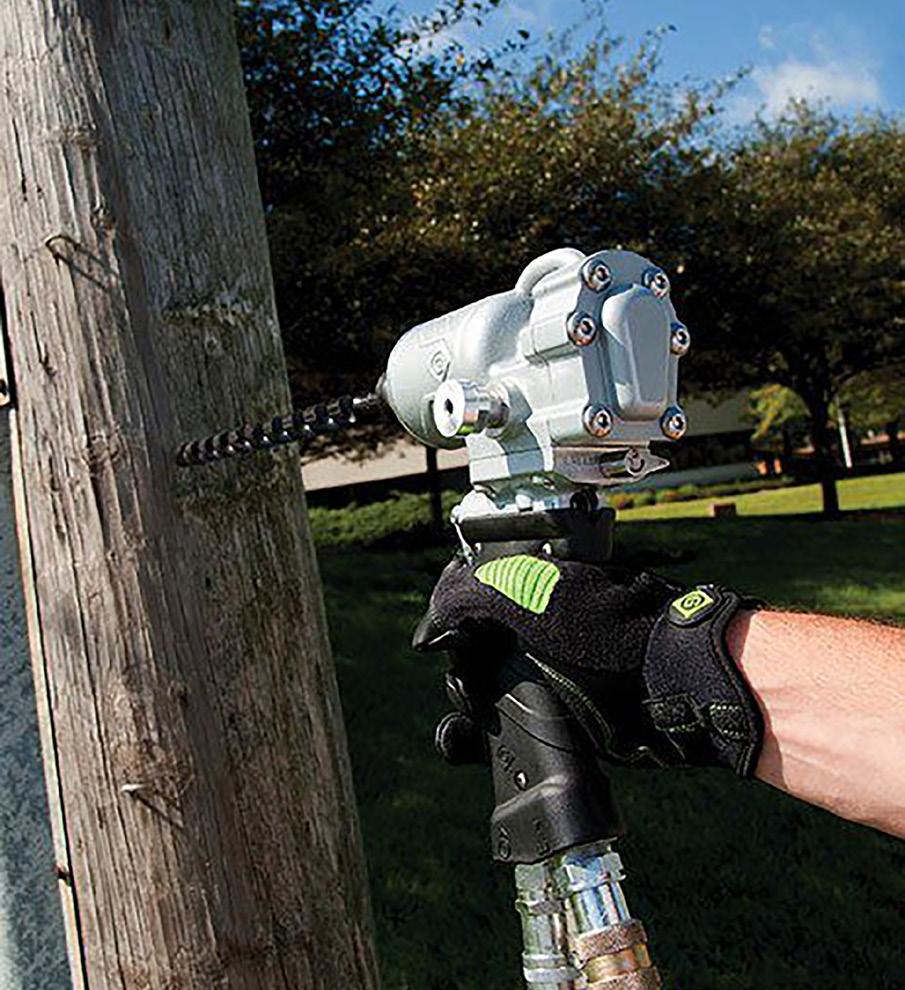 Auxiliary PTO oil outlets in the Hydralada platform allow you to connect hydraulic tools, drills, impact wrenches. Shown in this picture is an impact wrench with nail eating drill bit drilling hardwood poles with ease.