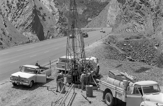 Background/History: The above DWR photograph dated 7-27-64 shows a geotechnical drilling rig, drill crew, and DWR engineering geologists collecting soil and rock core samples along the historic US Route 99 in preparation for the construction of Pyramid Dam, a critical component of the West Branch of the CA Aqueduct and State Water Project (Figure 1). The interesting and large topographic feature in the background of the photograph is the famous Pyramid Rock, after which the dam was named. Pyramid Dam was built by DWR from 1969-1973 and provides water storage, recreation, and fishery enhancement for the greater Los Angeles area. The dam is an earth and rock embankment type structure with a height of 400 feet, length of 1,090 feet, and a storage capacity of about 170,000 acre-feet (Figure 2). The dam is built across Piru Creek in Los Angeles County.