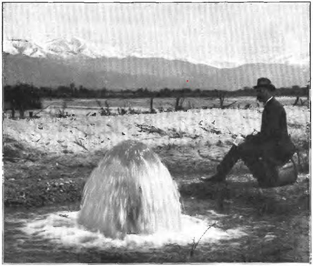 end of the irrigating season while all the wells were open and after they had been flowing freely during the summer. The pressure, expressed as that exerted by a column of water (in feet), was measured in each well while it was closed. Figure 1 displays a photograph of well number 43, the most productive among the Gage Canal wells.