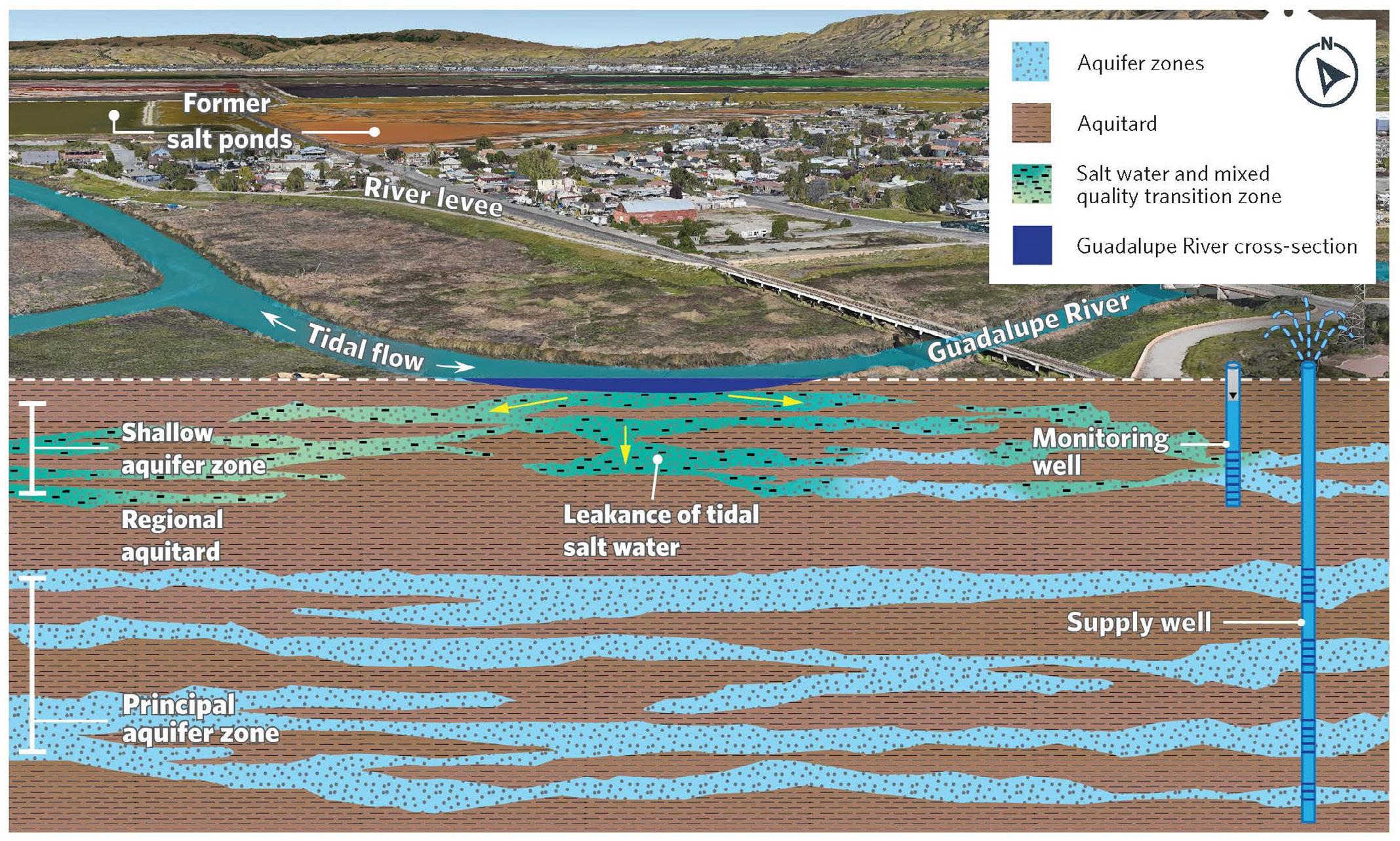 Because of the Bay mud and clay aquitards, the classic case of seawater intrusion with a saltwater wedge has a relatively minor role in the Santa Clara Subbasin. Rather, leakance of saltwater and brackish water beneath tidal stream channels is likely the most important mechanism that affects the overall spatial extent and inland migration of seawater intrusion in the Santa Clara Subbasin (Figure 1). Tidally influenced stream reaches extend considerable distances inland, generally aligning with the inland extent of maximum historical (circa 1960) seawater intrusion, supporting the conceptual model that tidal stream flow leakance is a key mechanism of seawater intrusion in the shallow aquifer.
