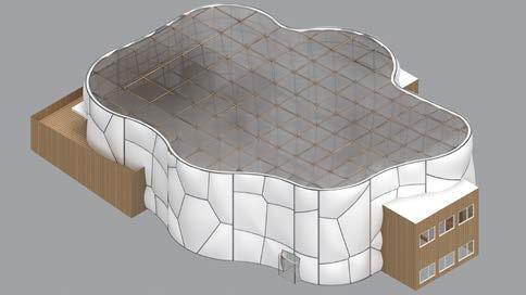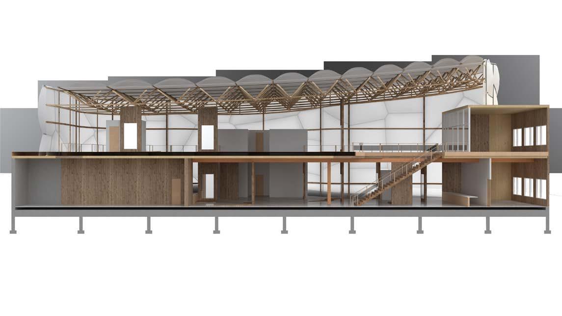 The Fashion Library reuses CLT panels from the First Nations Elementary School, Canada, and “cannibalizes” the parts into the design. The irregular panels shape the floor plate and frame the rest of the structural elements. A new wooden space frame roof and wall system hold up the ETFE which delicately diffuses the light into the building. Like that of a puffer jacket, the ETFE with the reused CLT makes a statement to continue reusing and repurposing clothing, and architectural materials, in a circular economy.