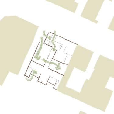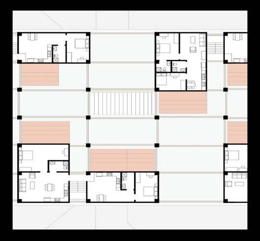 To provide residents and surrounding communities with a variety of encounters, the design steps in and out to provide multiple levels of connections and privacy. People will be able to meet and encounter others in public spaces, and semi-private encounters are provided in the cores on each floor.