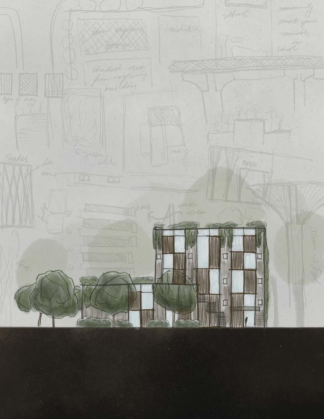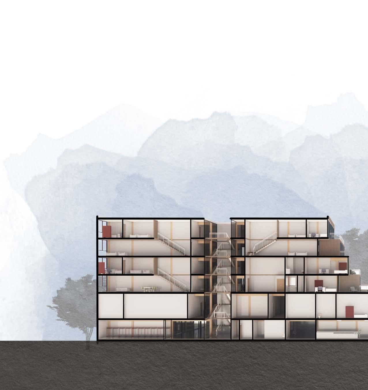 LOCAL MATERIAL USED FOR FACADE CLADDING LOW CARBON TIMBER FOR STRUCTURE LOW CARBON AND MINIMAL USE OF STEEL