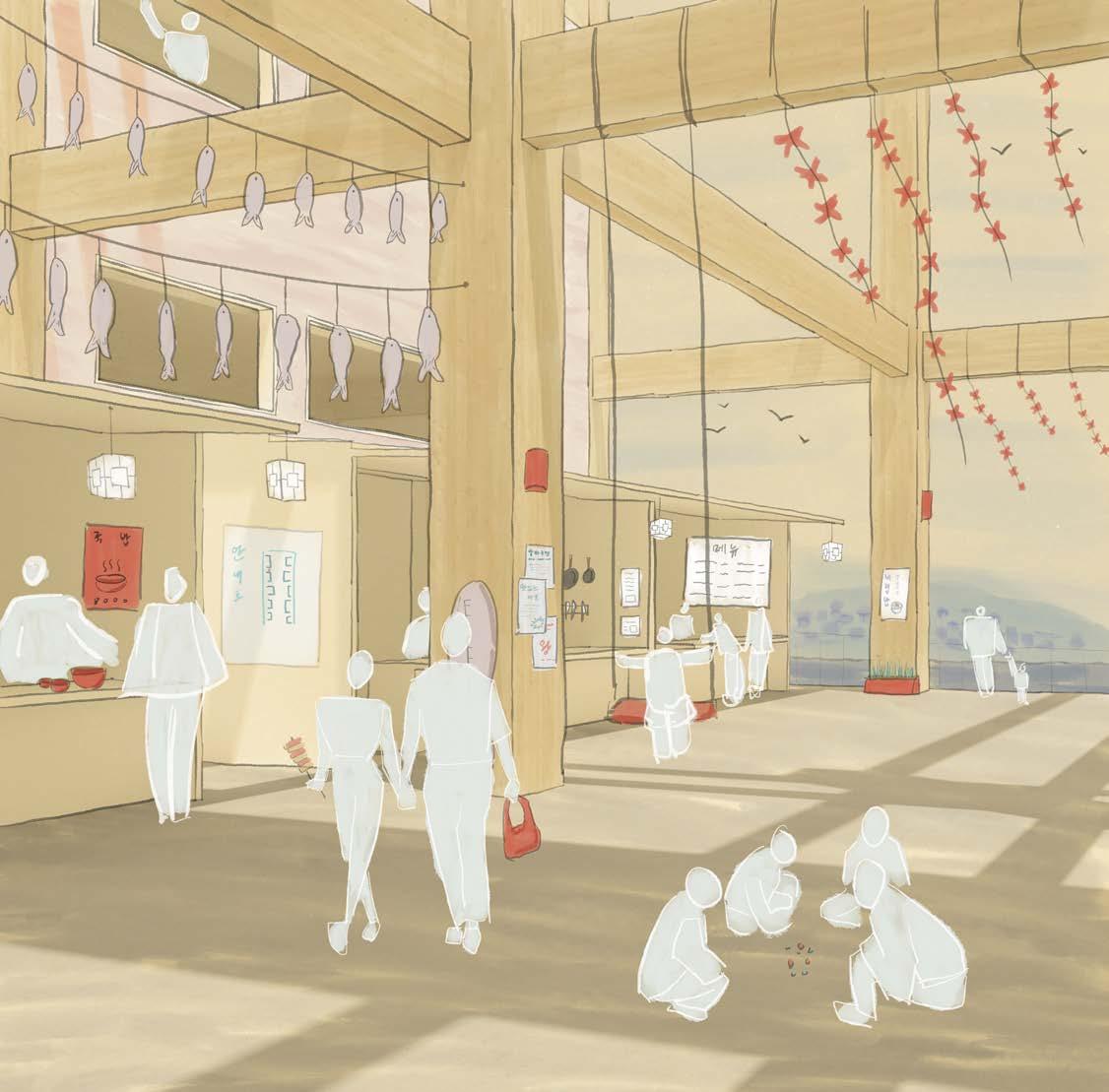 Located in the coastal city of Busan, South Korea, next to a wholesale fish market, the Inter-Horizons Market continues the history and culture that shaped Busan by incorporating two distinct markets that highlight the day and night culture of Busan. The project achieves flexibility through a rigid timber frame that houses ‘inserts’, the built units, that are easily exchangeable depending on the needs of the time.