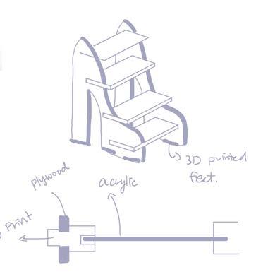 This project used CNC, 3D printing, and the laser cutter. The main structure and design was CNC-ed, the feet were 3D printed to protect the plywood, and acrylic film was laser cut to fit into the platforms to protect the design from dirt, dust, etc. from the shoes.