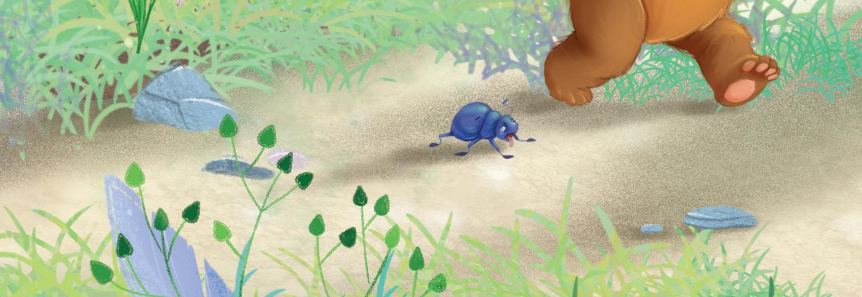 Sedan ändrar han sig. ”Kom igen Teddy”, ropar han, ”tistlar har rötter. Dem kommer du gilla.” Bra, tänker Teddy, då behöver jag inte äta upp den där snälla skalbaggen.