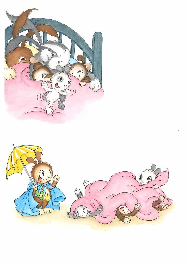 När kaninfamiljen vaknade den här morgonen låg de kvar i sin stora, blåa säng och lyssnade på ett ljud. Det lät dripp, dropp, dripp, dropp mot fönsterrutan. Vad kunde det vara för ljud? Javisst, det regnade. Det var så mysigt att ligga där och lyssna på regnet. Plötsligt hoppade tvillingarna Pim och Pom upp ur sängen.
