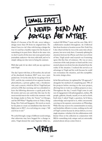 washed Off-White™ jeans and his own Nike AF-1 collaborative sneakers throughout. As I followed him from location to location across New York City, I also observed that he was at the same time always present, but never truly there. Constantly splitting his attention between his iPhone and what was in front of him, Virgil acted—and reacted—as if teetering upon this fine line of existence. He was at once, conscious of the task/project at hand and the (very storied) players involved, but also detached from the reality of the situation. I realized this served as an advantage to Virgil and his work because he could not overanalyze the situation, and this exemplifies his entire design ethos.