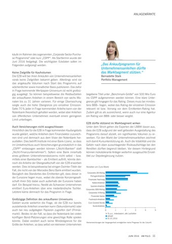 käufe im Rahmen des sogenannten „Corporate Sector Purchase Programme“ oder kurz „CSPP“. Als Starttermin wurde der Juni 2016 festgelegt. Die wichtigsten Eckdaten sollen im Folgenden aufgezeigt werden. Keine Zielgröße für Kaufvolumen Die EZB will bei ihren Ankäufen von Unternehmensanleihen vorab keine Zielgrößen bekannt geben. Allerdings wird sie das angekaufte Volumen nach Start des Programms auf wöchentlicher sowie monatlicher Basis publizieren. Das dafür in Frage kommende Wertpapier-Universum ist recht großzügig ausgelegt. So können beispielsweise die Restlaufzeiten der ankaufbaren Anleihen in einem Bereich von sechs Monaten bis zu 31 Jahren variieren. Für einige Überraschung sorgte auch die hohe Obergrenze pro einzelner Emission: Satte 70 % jeder in Frage kommenden Anleihe kann von der Notenbank theoretisch gehalten werden, wobei aber Anleihen von öffentlichen Unternehmen eventuell einem geringeren Limit unterliegen. Auch Versicherungen nicht ausgeschlossen Hinichtlich des für die EZB in Frage kommenden Kaufangebots wurde geklärt, welche Anleihen dem Finanzsektor zuzurechnen sind und demnach aus dem Visier der Notenbank herausfallen. Dies betrifft Institute mit einer Bank-Lizenz, so dass im Umkehrschluss auch Versicherungen grundsätzlich in das „CSPP“ einbezogen werden können („Nicht-Banken“ statt „Nicht-Finanzunternehmen“). Sofern eine Bank innerhalb eines größeren Unternehmenskonzerns nicht selbst – bzw. mittels einer Banktochter – als Emittent auftritt, könnte dennoch die Anleihe der Obergesellschaft von der EZB erworben werden. Dies ist beispielsweise bei einigen Daimler-Titeln der Fall, die nicht von der Mercedes Benz Bank emittiert wurden. Bezüglich des Standortes des Emittenten gilt, dass dieser in der Eurozone liegen muss, wobei die oberste Konzerngesellschaft ihren Sitz dabei auch außerhalb der Eurozone haben darf. Ein Beispiel hierzu: Nestlé als Schweizer Unternehmen emittiert Euro-Anleihen über eine niederländische Tochter. Letztere käme demnach für das Programm in Frage. Großzügige Definition des ankaufbaren Universums Geklärt wurde weiterhin die Frage, ob die EZB nur bereits ausstehende Anleihen erwerben kann (Sekundärmarkt) oder auch bei neu aufgelegten Papieren zugreifen darf (Primärmarkt). Beides ist der Fall, so dass die Notenbank bei vielen künftigen Bond-Platzierungen eine gewichtige Rolle spielen könnte. Dabei existiert auch keine Mindestgrenze für die Größe der Anleihen, so dass selbst von kleineren Unternehmen