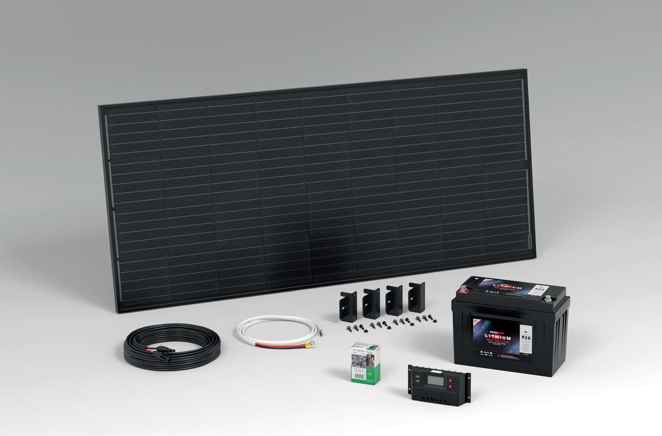 Inneholder: 200W PERC-panel, 100Ah Lithium Ultra batteri, 20A PWM-regulator og koblingsmateriell.