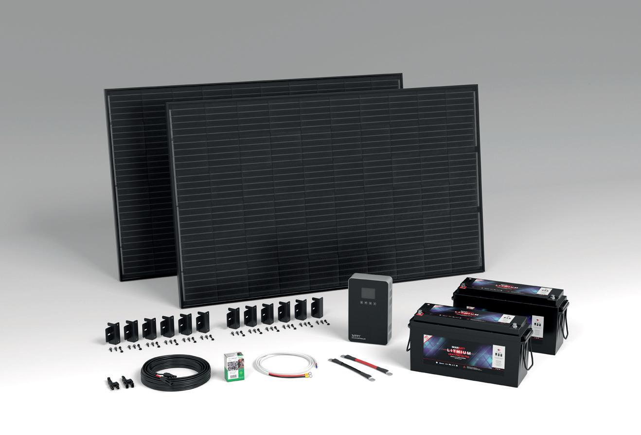 2stk 335W solcellepanel, veggfestebraketter og skruer, 10m monteringskabel 2x6mm2 med MC4 smartkobling, 100 stk sorte ledningsklips, 2x200Ah Lithium ULTRA med Heat & Bluetooth, 60A MPPT regulator samt riktig dimensjonert tilkoblingsmateriell/ledninger.