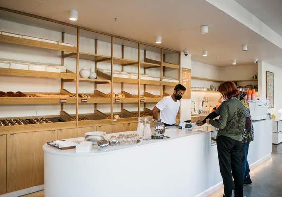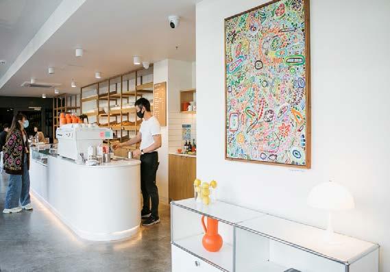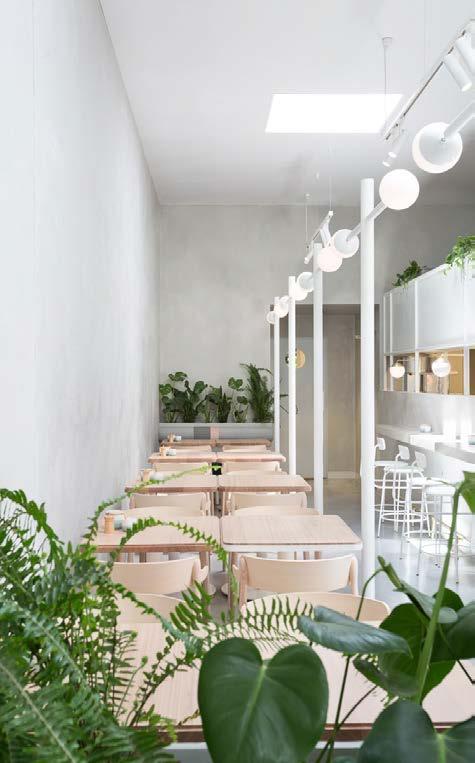 Our concept was inspired by the Greek delicatessens that flourished around Melbourne in the 1950s. Materially, concrete surfaces – the counter, walls and floor – give the space a warmth and sophistication, offset by refined brass elements. Timber-topped tables with banquette seating and Pedrali chairs run the length of the space. At intervals, lightweight steel framing with in-built lighting becomes a sculptural element.