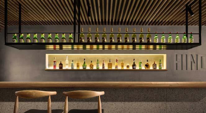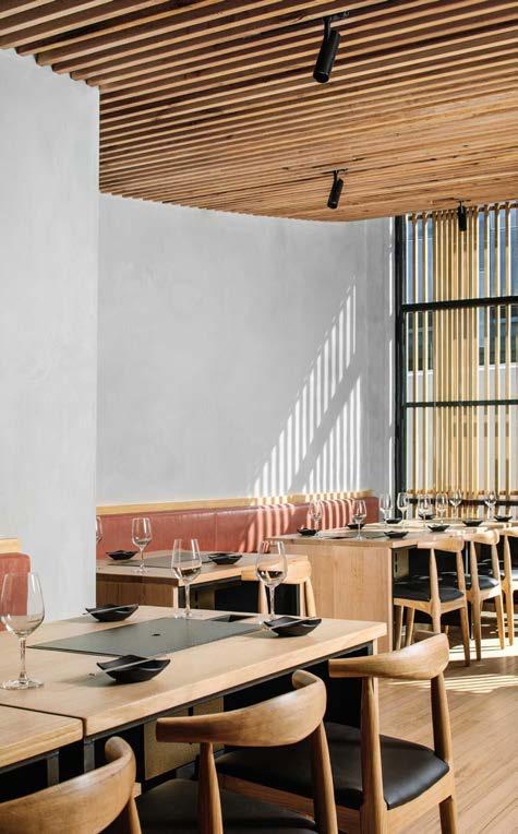 Our design for the project focused on creating a warm, cosy and intimate space. Spatially, the interior is structured by two banks of timber tables with integrated charcoal barbecues. Specifying LED backlighting rather than pendants retains the sense of openness and visual connections throughout the space. The striking timber-battened ceiling descends gently as it extends through the restaurant, curving into the rear wall alongside the terrazzo-clad bar.