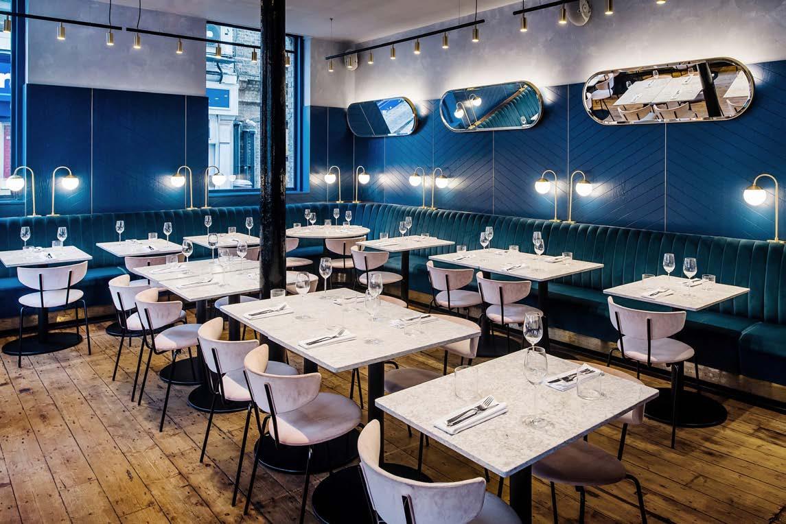 Spanning two floors, the venue comprises the main dining room, cocktail bar and private dining at ground level, with a more intimate bar and night spot, the open kitchen and amenities in the basement. The materials palette combines plush velvet, polished brass elements, timber paneling and cool marble surfaces. Overhead, angled oval mirrors create unexpected connections between groups of diners.