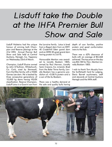 Lisduff take the Double at the IHFA Premier Bull Show and Sale Lisduff Holsteins had the unique honour of winning both Champion and Reserve placings at the 41st IHFA Annual Premier Bull Show and Sale held at Central Auctions, Nenagh, Co. Tipperary on Wednesday 23rd of March. Champion, Lisduff Elusive owned by John O’Sullivan, Whitechurch, Co. Cork, sired by Stonewall, from the Ellen family, with a VG85 Gomez Lee dam. He is backed by three consecutive generations of 10,000 kg dams having VG/EX classification. Reserve Champion, Lisduff Lotus is a Guarini son from