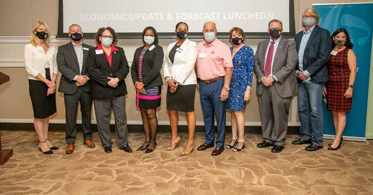 Left to right: Dawn Willis, Brian Wetzel, Amy DeYoung and Tonja Mosley, all with Orlando Health; West Orange Chamber of Commerce Chair Camille Evans with Virtus LLP; Ocoee Mayor Rusty Johnson; West Orange Chamber of Commerce President Stina D’Uva; Dr. Alexander Cartwright, president of the University of Central Florida; Dr. Sean Snaith, director of the UCF Institute for Economic Forecasting; and Heather Easterling with Boyd Development and the community of Hamlin