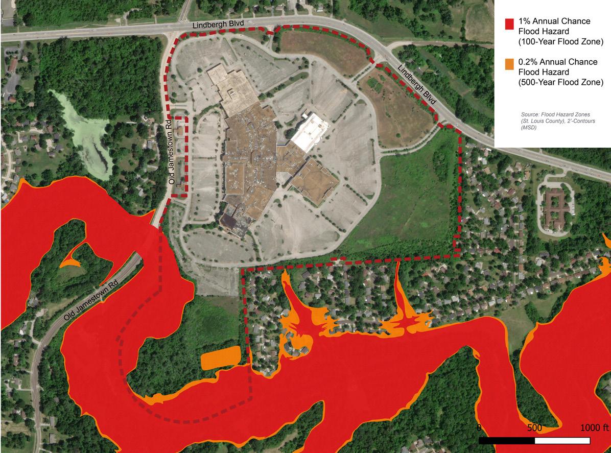 • A great deal of housing potential was eliminated when St. Louis County authorities prohibited further development immediately north of the mall across U.S. 67/Lindbergh Boulevard. The earth in that area remains too unstable as Karst topography (sinkholes) influenced by the geology of the Mississippi and Missouri Rivers. Typical suburban scale densities cannot be supported. A huge potential market for shopping at Jamestown did not materialize.