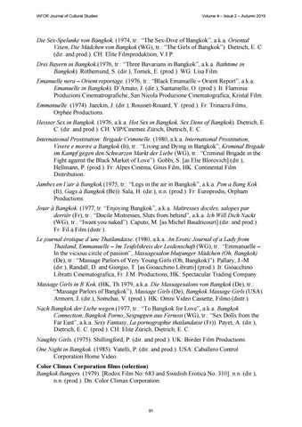 Die Sex-Spelunke von Bangkok. (1974, tr.: “The Sex-Dive of Bangkok”, a.k.a. Oriental Vixen, Die Mädchen von Bangkok (WG), tr.: “The Girls of Bangkok”). Dietrich, E. C. (dir. and prod.). CH: Elite Filmproduktion, V.I.P. Drei Bayern in Bangkok.(1976, tr.: “Three Bavarians in Bangkok”, a.k.a. Bathtime in Bangkok). Rothemund, S. (dir.), Tomek, E. (prod.). WG: Lisa Film. Emanuelle nera – Orient reportage. (1976, tr.: “Black Emanuelle – Orient Report”, a.k.a. Emanuelle in Bangkok). D’Amato, J. (dir.), Santaniello, O. (prod.). It: Flaminia Produzioni Cinematrografiche, San Nicola Produzione Cinematografica, Kristal Film. Emmanuelle. (1974). Jaeckin, J. (dir.), Rousset-Rouard, Y. (prod.). Fr: Trinacra Films, Orphée Productions. Heisser Sex in Bangkok. (1976, a.k.a. Hot Sex in Bangkok, Sex Dens of Bangkok). Dietrich, E. C. (dir. and prod.). CH: VIP/Cinemec Zürich, Dietrich, E. C. International Prostitution: Brigade Criminelle. (1980, a.k.a. International Prostitution, Vivere e morire a Bangkok (It), tr.: “Living and Dying in Bangkok”, Kriminal Brigade im Kampf gegen den Schwarzen Markt der Liebe (WG), tr.: “Criminal Brigade in the Fight against the Black Market of Love”). Gobbi, S. [as Elie Blorovich] (dir.), Hellmann, P. (prod.). Fr: Alpes Cinéma, Ginis Film, HK: Continental Film Distribution. Jambes en l’air à Bangkok.(1975, tr.: “Legs in the air in Bangkok”, a.k.a. Pon a Bang Kok (It), Gags à Bangkok (Be)). Sala, H. (dir.), n.n. (prod.). Fr: Europrodis, Orpham Productions. Jouir à Bangkok. (1977, tr. “Enjoying Bangkok”, a.k.a. Maîtresses dociles, salopes par derrièr (Fr), tr.: “Docile Mistresses, Sluts from behind”, a.k.a. Ich Will Dich Nackt (WG), tr.: “Iwant you naked”). Caputo, M. [as Michel Baudricourt] (dir. and prod.). Fr: Fil à Film (distr.). Le journal érotique d’une Thaïlandaise. (1980, a.k.a. An Erotic Journal of a Lady from Thailand, Emmanuelle – Im Teufelskreis der Leidenschaft (WG), tr.: “Emmanuelle – In the vicious circle of passion”, Massagesalon blutjunger Mädchen (Oh, Bangkok) (De), tr.: “Massage Parlors of Very Young Girls (Oh, Bangkok)”). Pallary, J.-M. (dir.), Randall, D. and Giorgio, T. [as Gioacchino Libratti] (prod.). It: Gioacchino Libratti Cinematografica, Fr: J.M. Productions, HK: Spectacular Trading Company. Massage Girls in B’Kok. (HK, Th 1979, a.k.a. Die Massagesalons von Bangkok (De), tr.: “Massage Parlors of Bangkok”), Massage Girls (De), Bangkok Massage Girls (USA). Armorn, J. (dir.), Somchai, V. (prod.). HK: Omni Video Cassette, Filmo (distr.). Nach Bangkok der Liebe wegen.(1977, tr.: “To Bangkok for Love”, a.k.a. Bangkok Connection, Bangkok Porno, Sexpuppen aus Fernost (WG), tr.: “Sex Dolls from the Far East”, a.k.a. Sexy Fantasy, La pornographie thaïlandaise (Fr)). Payet, A. (dir.), Dietrich, E. C. (prod.). CH: Elite Zürich, Dietrich, E. C. Naughty Girls. (1975). Shillingford, P. (dir. and prod.). UK: Border Film Productions. One Night in Bangkok. (1985). Vatelli, P. (dir. and prod.). USA: Caballero Control Corporation Home Video. Color Climax Corporation films (selection) Bangkok Bangers. (1979). [Rodox Film No. 683 and Swedish Erotica No. 310]. n.n. (dir.), n.n. (prod.). Dn: Color Climax Corporation.
