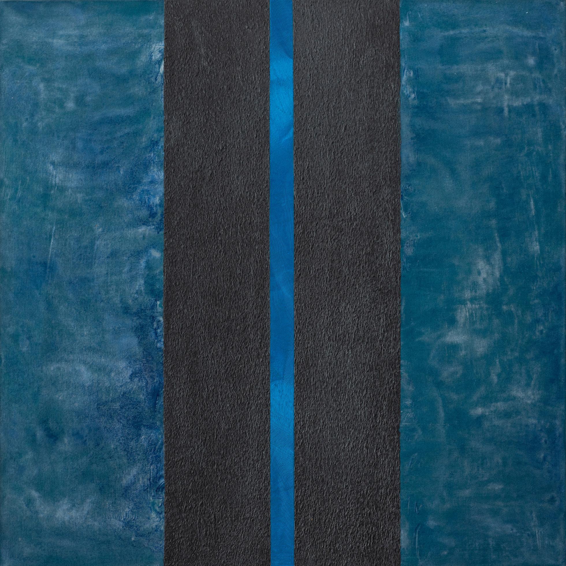Injection Painting - iar în centru se află un monolit pictural albastru: culoarea se îngroașă pe latura orizontală superioară a lucrării și pe măsură ce se scurge în centrul lucrării, se diluează treptat, întâlnind fundalul argintiu, pentru a se pierde în fragmente minuscule. Putem vedea în ea o inserție apoasă, o rugăciune cromatică, o cascadă orientală: este vizualizarea gândirii artistului care își ia zborul prin pictură? Sau scufundarea materiei în conceptul care stă la baza fiecărei creații?