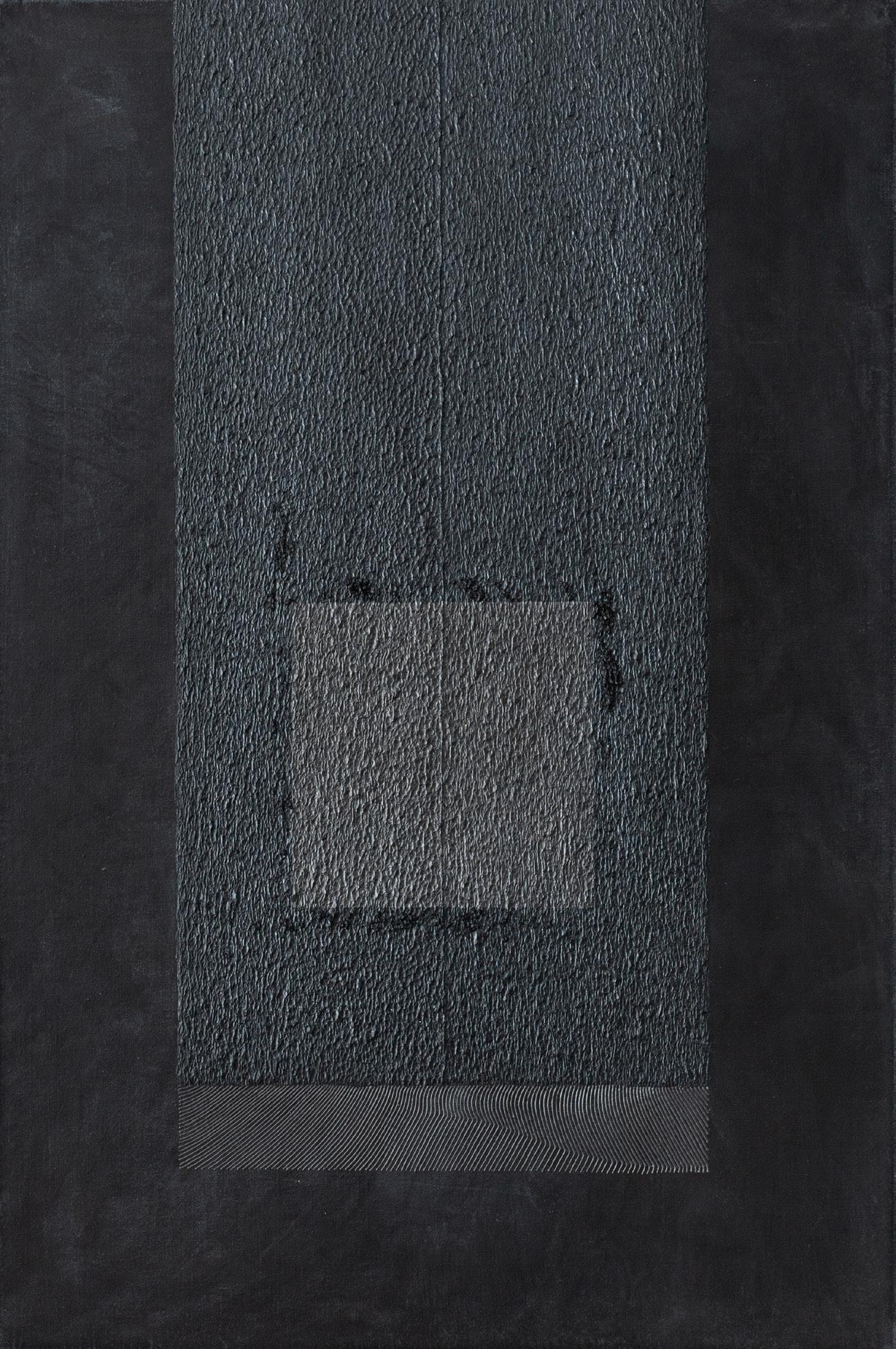 Parallelamente a questi riferimenti pittorici, per De Angelis un’altra affascinante fonte di ispirazione è l’architettura, o meglio, i segni lasciati dalle fondamenta – o da ciò che rimane di queste – dell’architettura nella terra: le tre tele dal titolo “Fondamenta” (2022) sono variazioni seducenti sul nero, che sovrapponendosi e articolandosi in rettangoli intrecciati, creano un reticolo di immagini geometriche concentriche, vibrando verso l’esterno del campo visivo e addensandosi in un possibile nucleo. Il nero, altro colore sapientemente dosato dall’artista nel suo mescolarsi con il bianco e ancor più i grigi e gli argenti, è una dimensione centrale anche di un altro lavoro, un grande dipinto dove la nerezza si incontra con la doratura, assecondando la formula compositiva di “Saut dans la Vide” che abbiamo poco sopra analizzato. Qui, il contrasto tra due colori per antonomasia simbolici dell’assoluto, oro e nero, è ammaliante e chiede una lenta, silenziosa contemplazione.