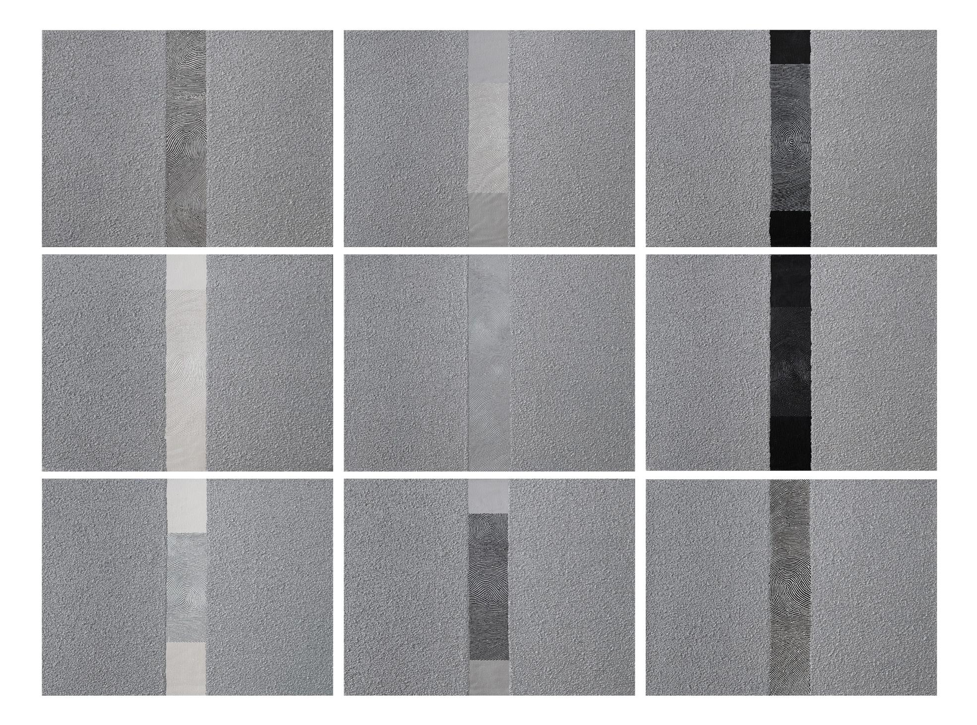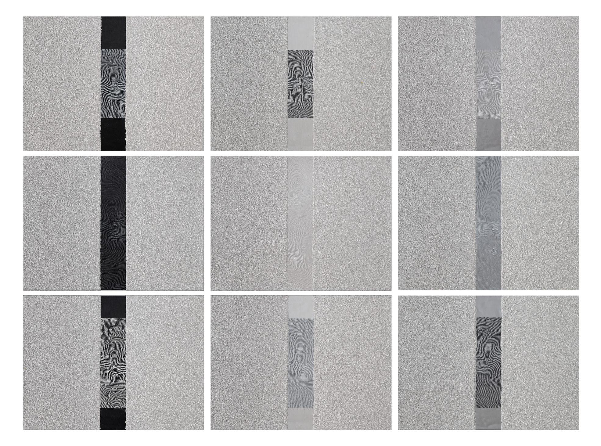 From this perspective, the pictorial panels that make up three polyptychs that the artist has been working on for some time, each of them entitled “Polittico delle maschere” / “Polyptych of Masks” (2022), must also be analysed. The graphic design, carefully studied, provides that on corresponding white, silver or black pictorial fields, whose surface evokes the seductive graininess of the epidermis, a central line crosses the monochrome and inserts, enlarged, the detail of each of the fingers of the artist’s hand, from the thumb to the little finger, from right to left. The result consists of works resembling very elegant bandages and gauzes, which protect the most intimate signs of our identity, unique and inimitable: the painting becomes the mouthpiece of human genetics. Seen as a whole, each “Polyptych” is thus the open album, flicked-through on the wall, of a “Self” that evokes another “Self”: the viewer, inviting him to take part in the declaration of diversity and uniqueness of each.